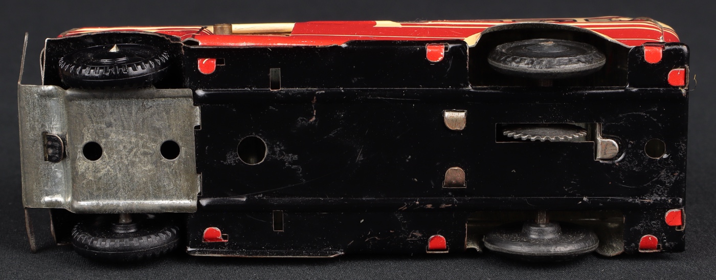 This eye-catching Mechanical Coach in bright red and cream has charming lithography and a working clockwork motor. One-piece black plastic wheels with tyre detail. Bright and complete ‘Tours’ on the roof and ‘POCKETOY TOURS’ on one side. Sliding side door. Measures approx 11cms.