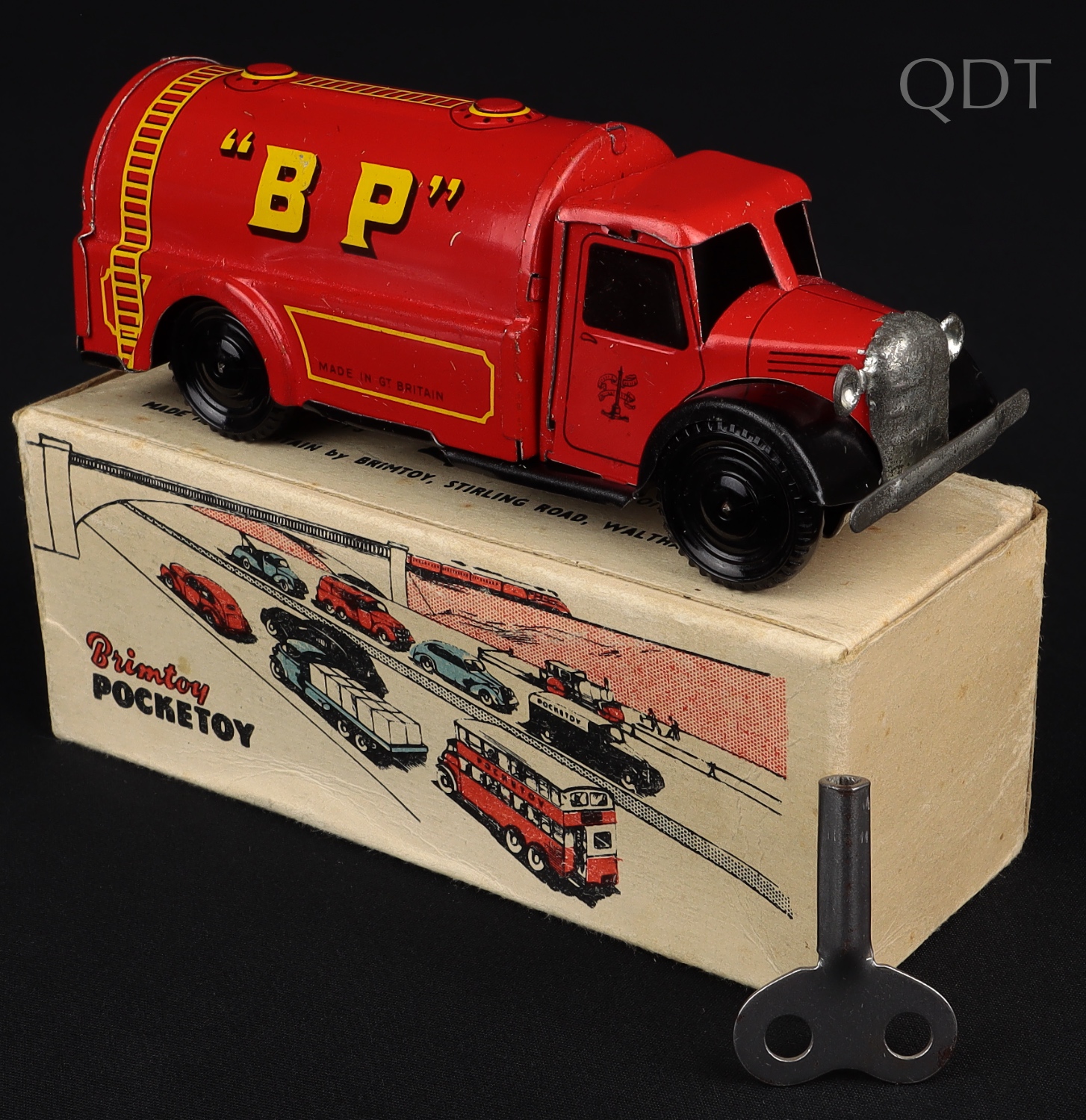 Wells Brimtoy 9/506 Mechanical Petrol Lorry 'BP' 'SHELL'. Clockwork. Near mint plus/boxed, with key. Scarce model from The Denis Tyler Collection. Starting bid £100. Please note that QDT apply 12.5% buyer's commission.