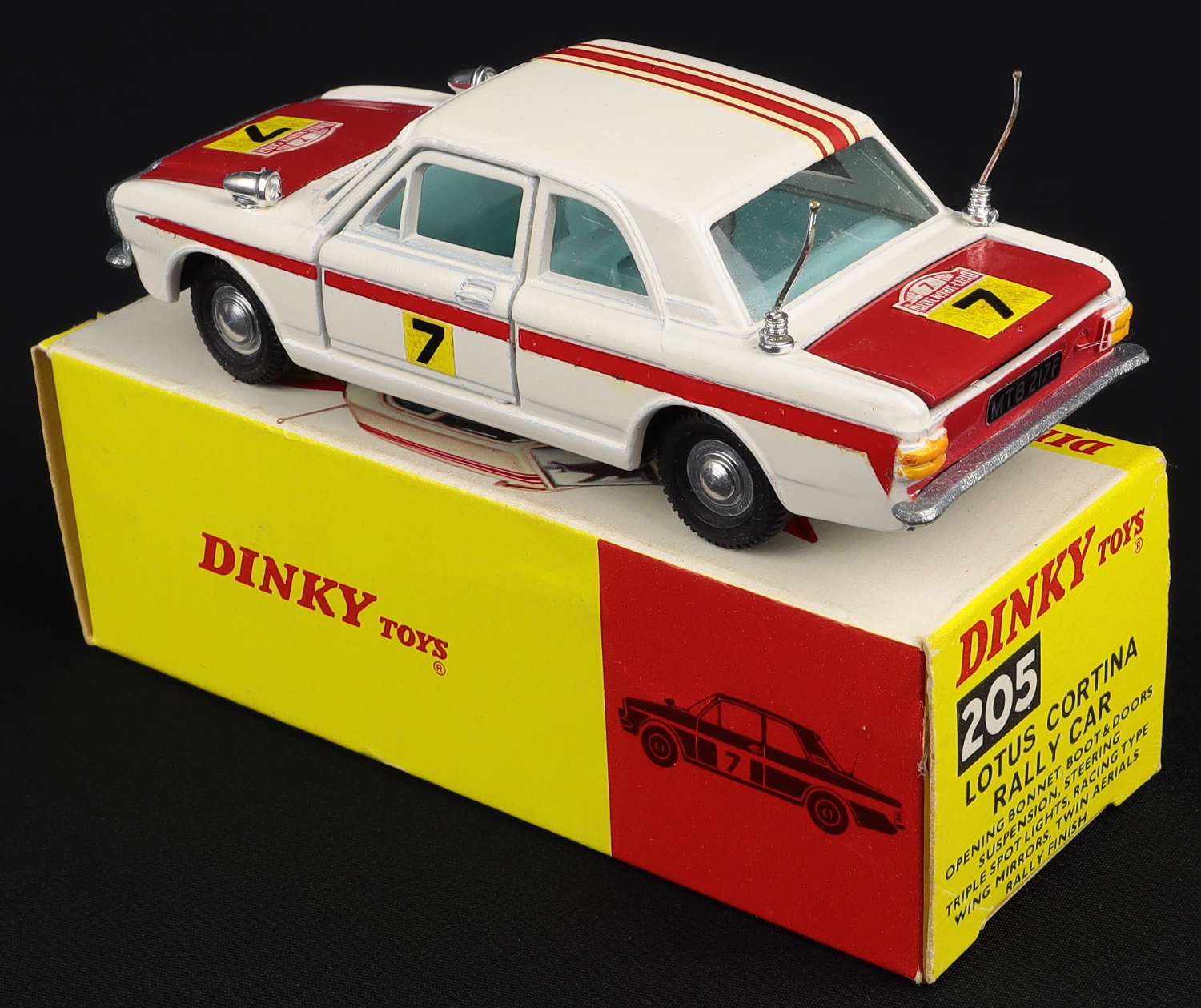 Complete and fresh-looking ‘Monte Carlo’ rally racing numbers at bonnet and boot (minor age transparency). Both aerials are intact (though a little bent due to the confines of the box and tiny dulling to one). Triple spotlights and wing mirrors. ‘F’ registration number plates at front and rear.