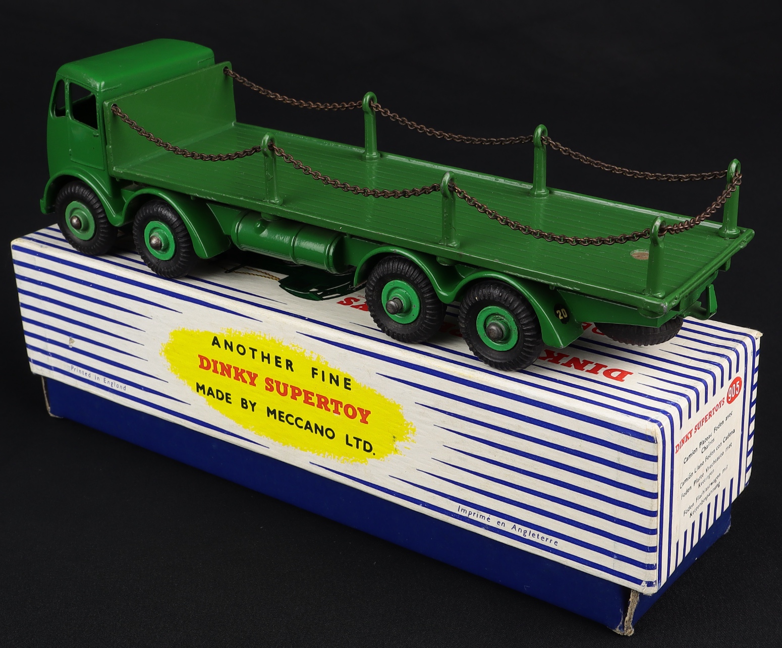 Foden Flat Truck with chains by Dinky Toys, No. 905. With domed chain post bosses. Near mint plus/boxed. From The Rickman Collection. QDT starting bid £200. Please note that QDT apply 12.5% buyer's commission.
