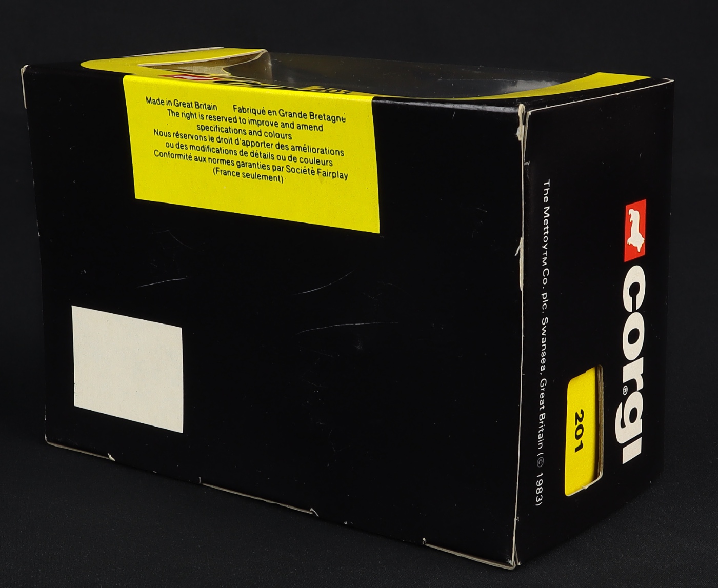 BMC Mini 1000 by Corgi Toys, No. 201. MID-METALLIC blue version with Racing Number 3. Scarce. Mint/boxed. From The Elmer Collection.