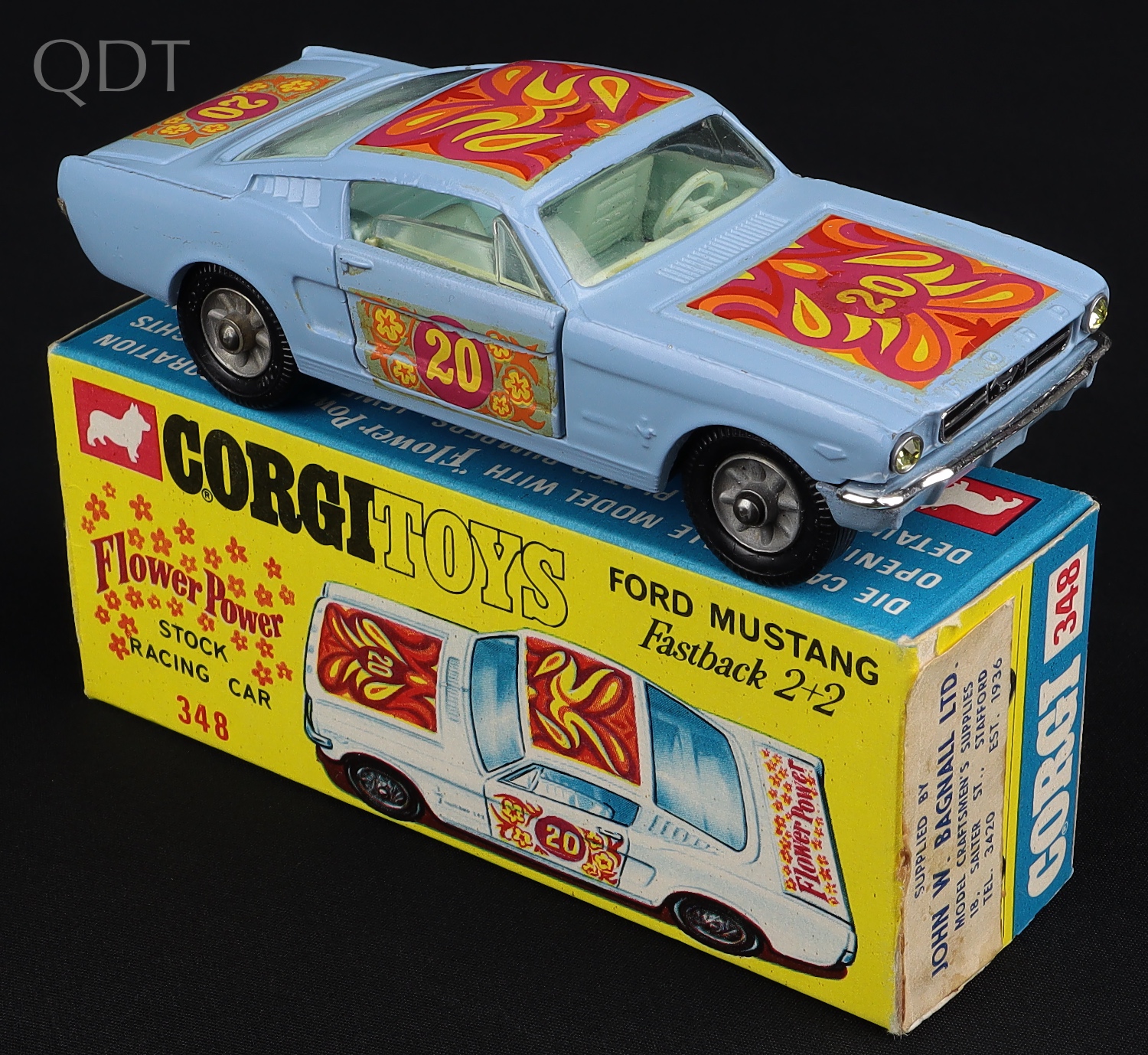 Ford Mustang Stock Racing Car 'Flower Power' by Corgi Toys, No.348. Very near mint/boxed. Scarce LATE issue with CORGI EMBOSSED NYLON TYRES. From The Elmer Collection.
