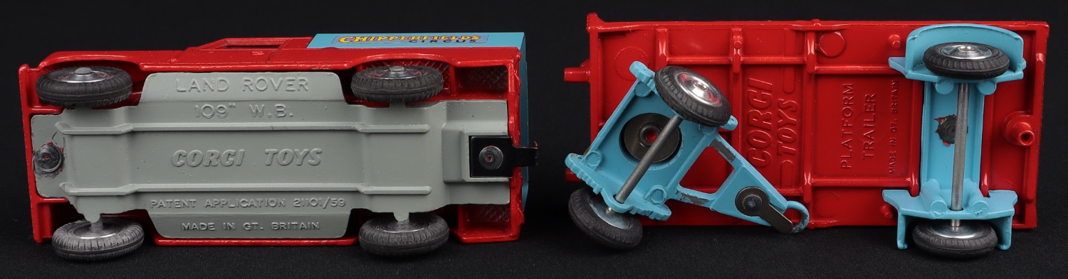 1) The Land-Rover has a tinplate canopy and shaped spun wheels. Suspension. It looks very smart and fresh with a gleaming original paint finish, complete with spare wheel on the bonnet. Complete and bright Chipperfield’s Circus labels on both side of the tinplate tilt. Fine, well-shaped original tyres.