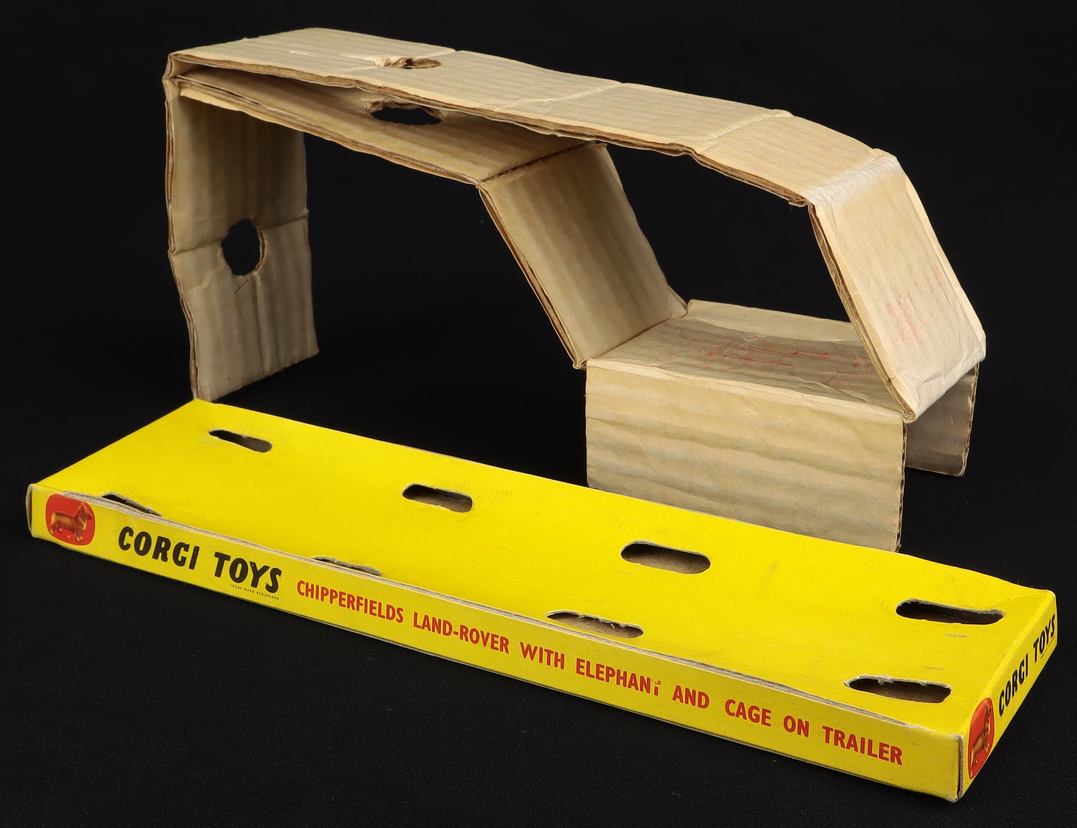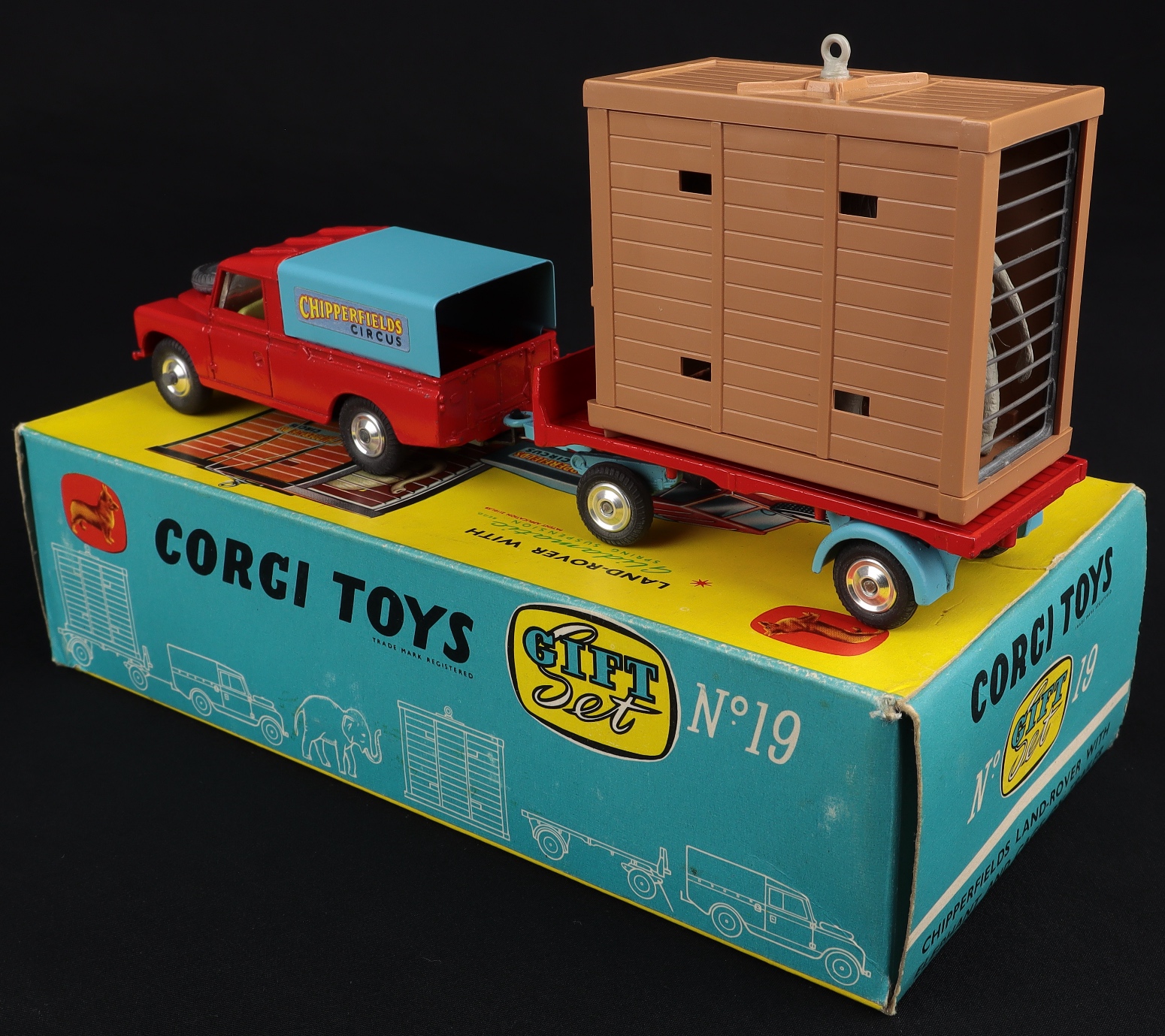 Chipperfields Land-Rover with Elephant & Cage on Trailer by Corgi Toys, Gift-Set, No. 19. Near mint plus - very near mint/boxed. Hard to find *1st issue* with tinplate tilt. With SCARCE EARLY wrap-around card packing. From The Elmer Collection.
