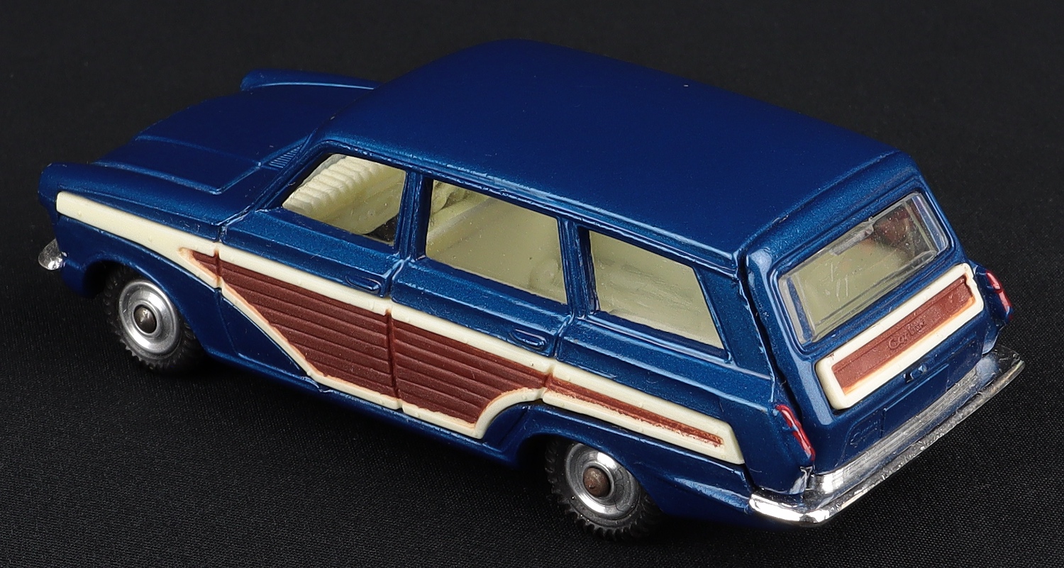1) Corgi 491 Ford Consul Super Estate Car with “wood” side panels, suspension on bright shaped spun wheels, jewelled headlights, cream interior and opening tailgate. Bright chrome. Fine, well-shaped tyres.