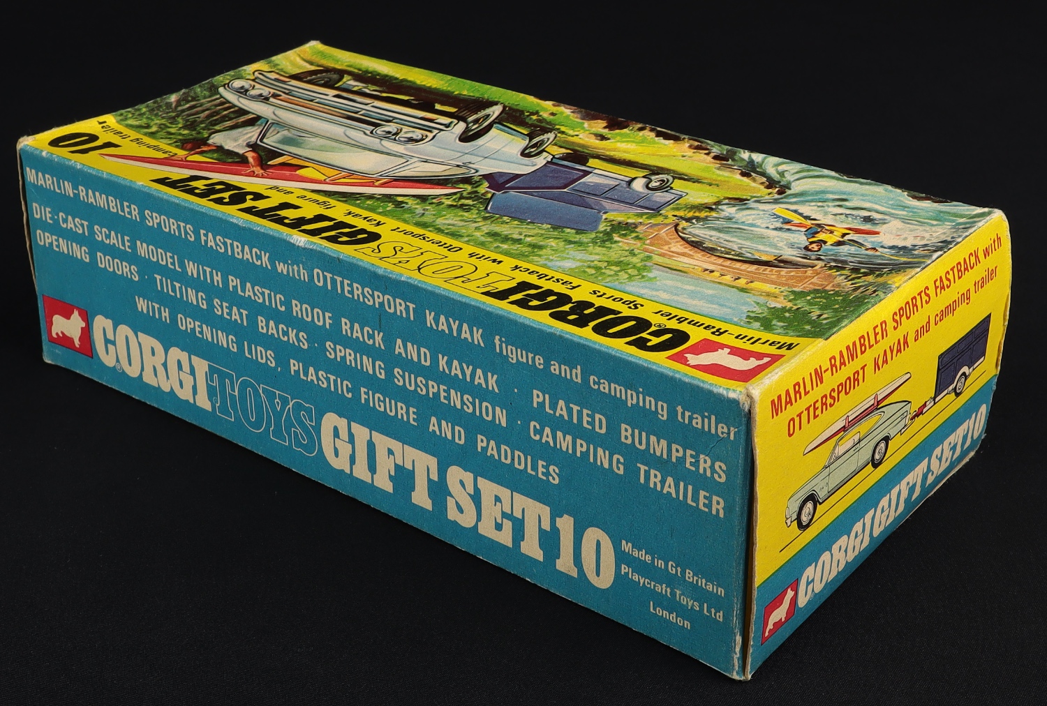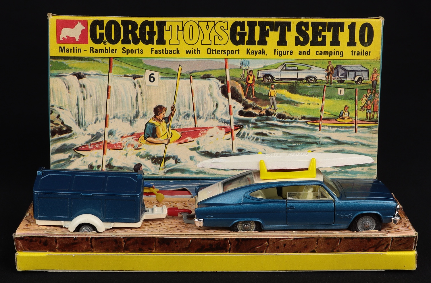 Marlin-Rambler Sports Fastback with Ottersport Kayak & Camping Trailer by Corgi Toys, Gift Set No. 10. Very, very near mint/boxed, with card packing. From The Elmer Collection.
