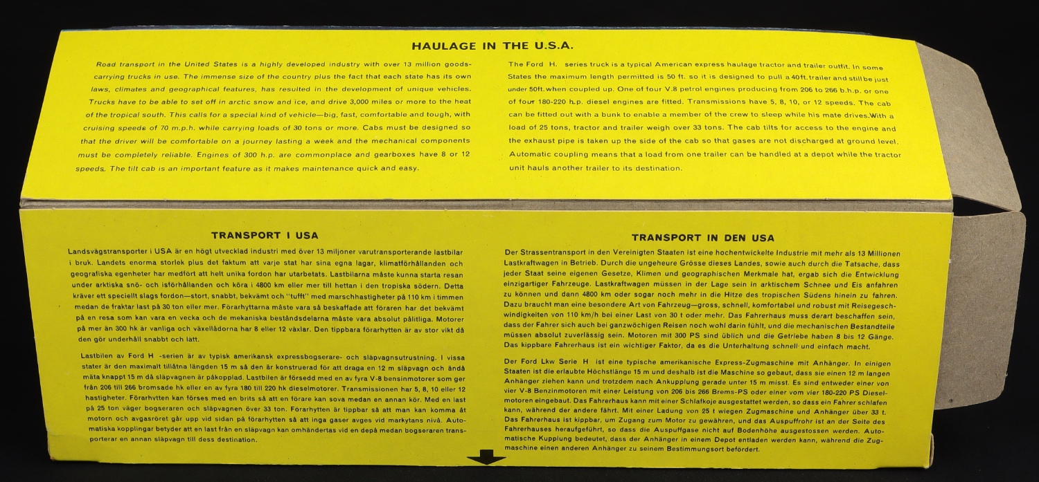Issued between 1966-69, this Ford articulated truck is a delight! In very close to mint condition, this truck is complete with both wing mirrors intact (including the little reflective ‘mirror’ pieces), straight gold-coloured horns on the cab roof, and perfect “EXPRESS SERVICE” detailing on both sides of the bright silver, untarnished sliding doors. So eye-catching and it comes complete with the original mechanic figure, too.