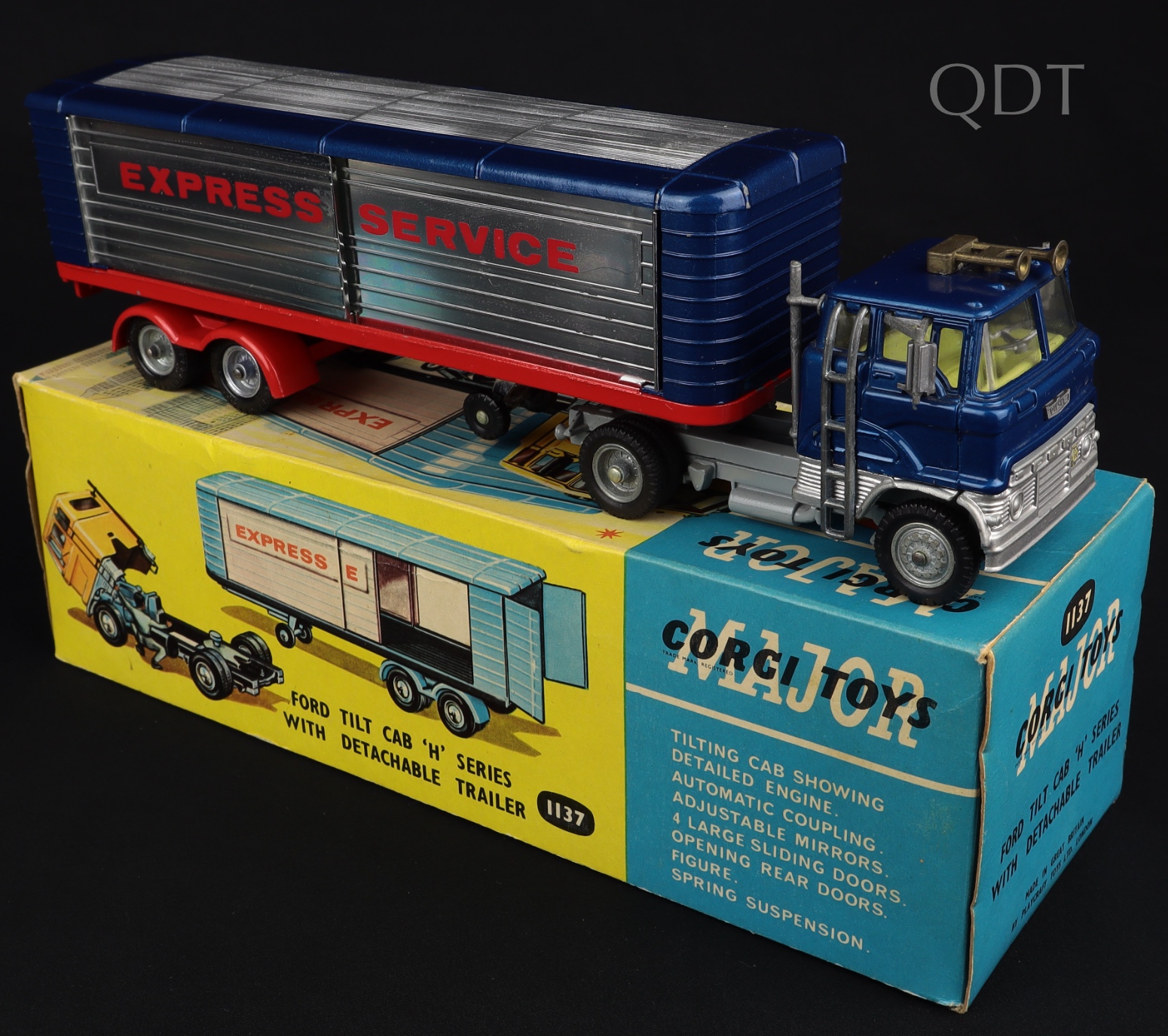 Ford Tilt Cab 'H' with Detachable Trailer "Express Service" by Corgi Toys, No. 1137. Cast wheels issue with GOLD roof horns. Very near mint/boxed. With mechanic and card packing piece.