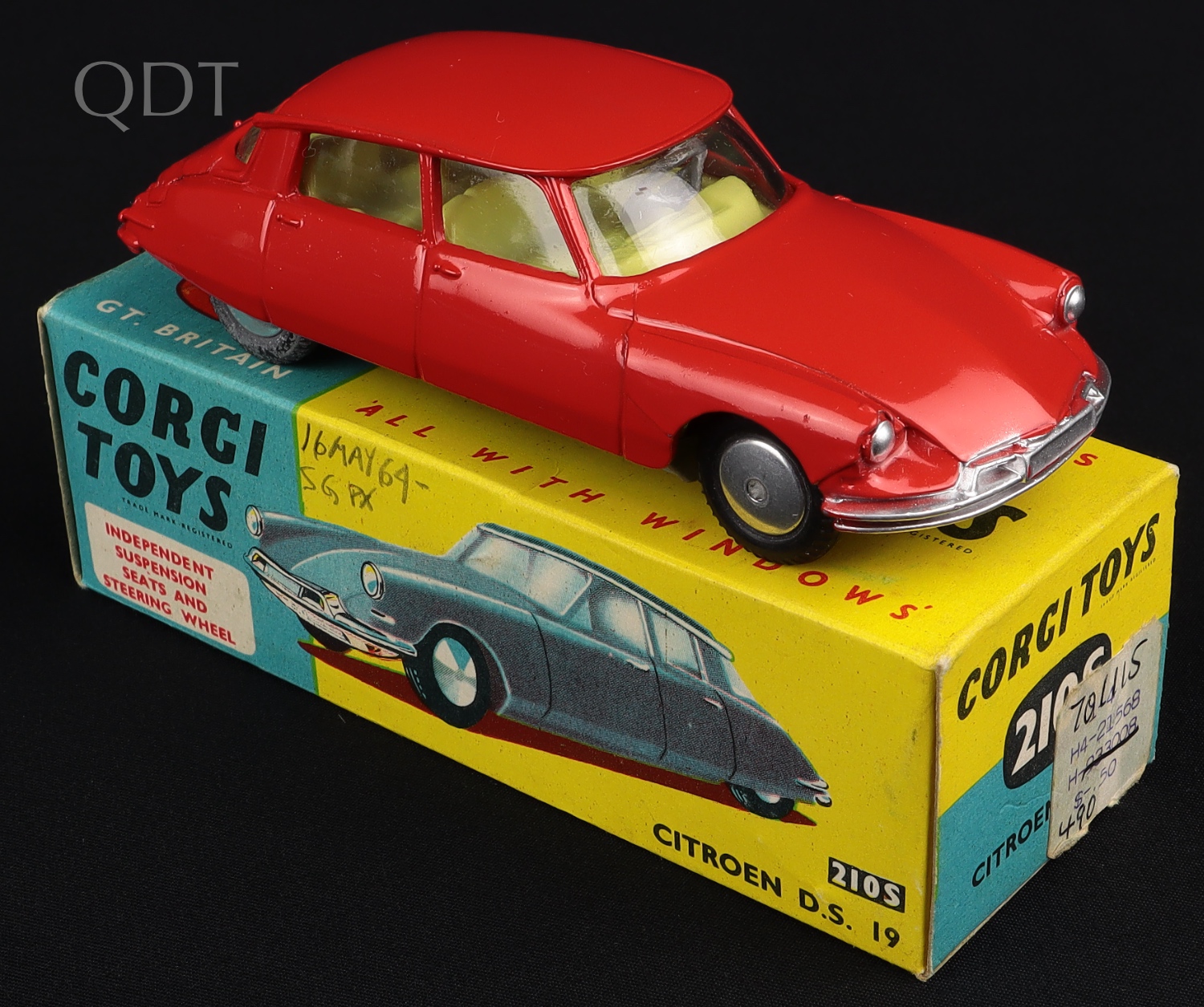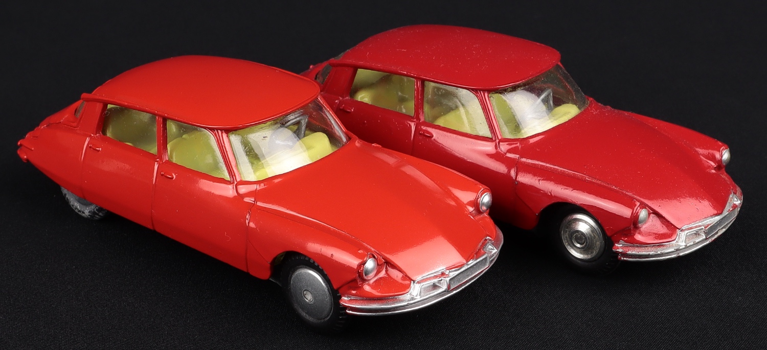 Citroen DS 19 by Corgi Toys, No. 210S. Very near mint/boxed. Tomato red, flat spun wheels issue. From The Rickman Collection.