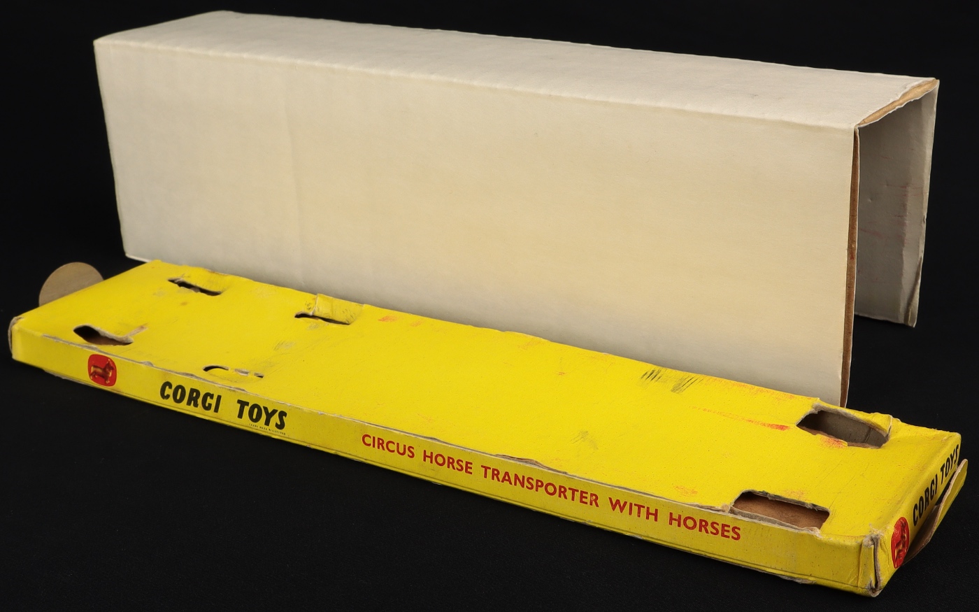 Circus Horse Transporter with Horses by Corgi Toys, No. 1130. Very, very near mint/boxed. Scarce with cast wheels! With six grey horses & individual wrap-around card packing. Card packing piece sleeve. Starting bid £250. Please note that QDT apply 12.5% buyer's commission.