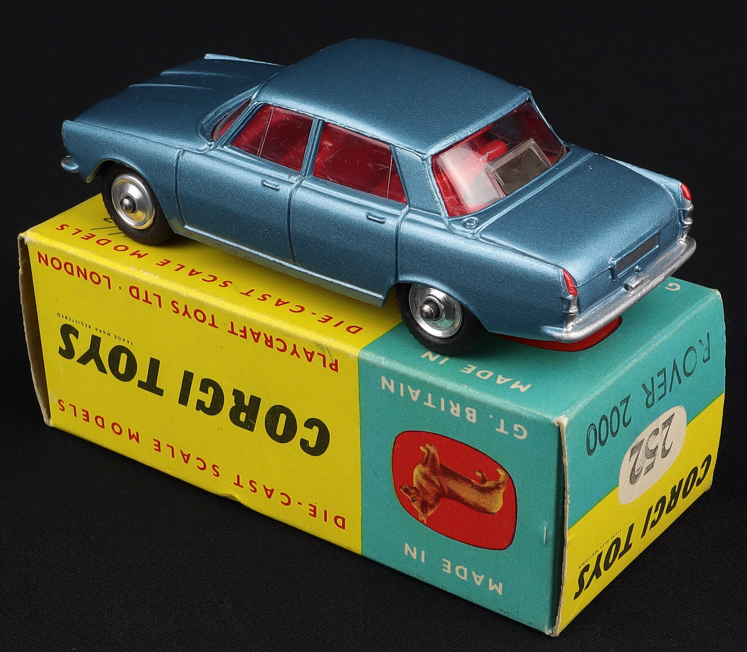 Rover 2000 by Corgi Toys, No. 252. Steel blue issue. Very, very near mint (factory assesmbly mark)/boxed. Rare plain box with 252 ROVER 2000 stamped ends. Starting bid £150. Please note that QDT apply 12.5% buyer's commission.