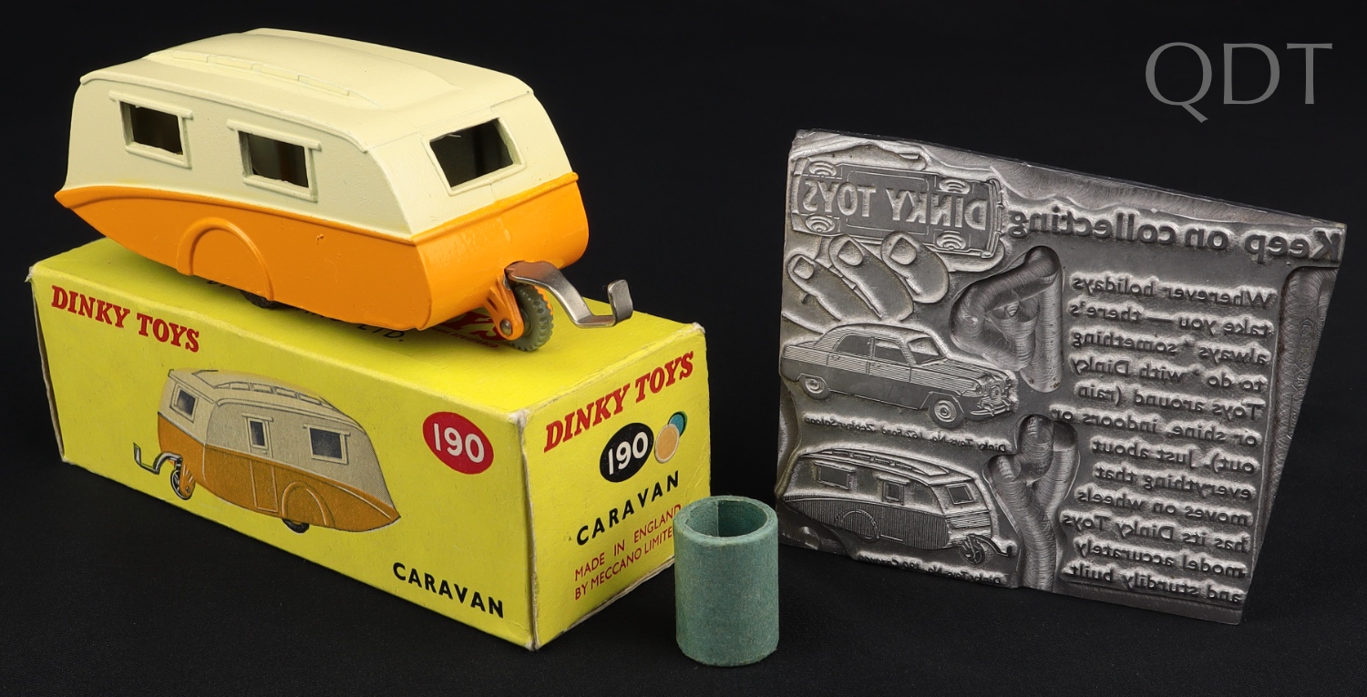 Caravan by Dinky Toys, No. 190. Yellow & Cream version. Very, very near mint/boxed, with card packing ring. Dinky Period Printing Plate. From The Reference Collection. Starting bid £150. Please note that QDT apply 12.5% buyer's commission.