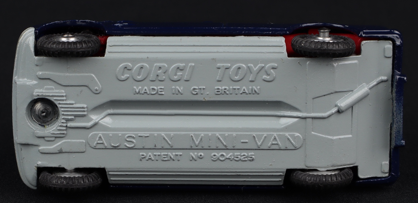 This popular Austin Mini Van was issued between 1964-69. Presents well with a gleaming deep blue original paint finish. Intact aerial. Jewelled headlights and suspension on shaped spun wheels. Complete POLICE labels on both sides. It comes with both original figures, complete with original lead.