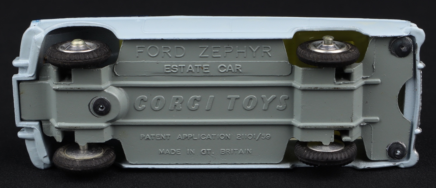 Ford Zephyr Estate Car by Corgi Toys, No. 424. Near mint plus/boxed. Harder to find with a yellow interior and shaped spun wheels. From The Eccles Collection.