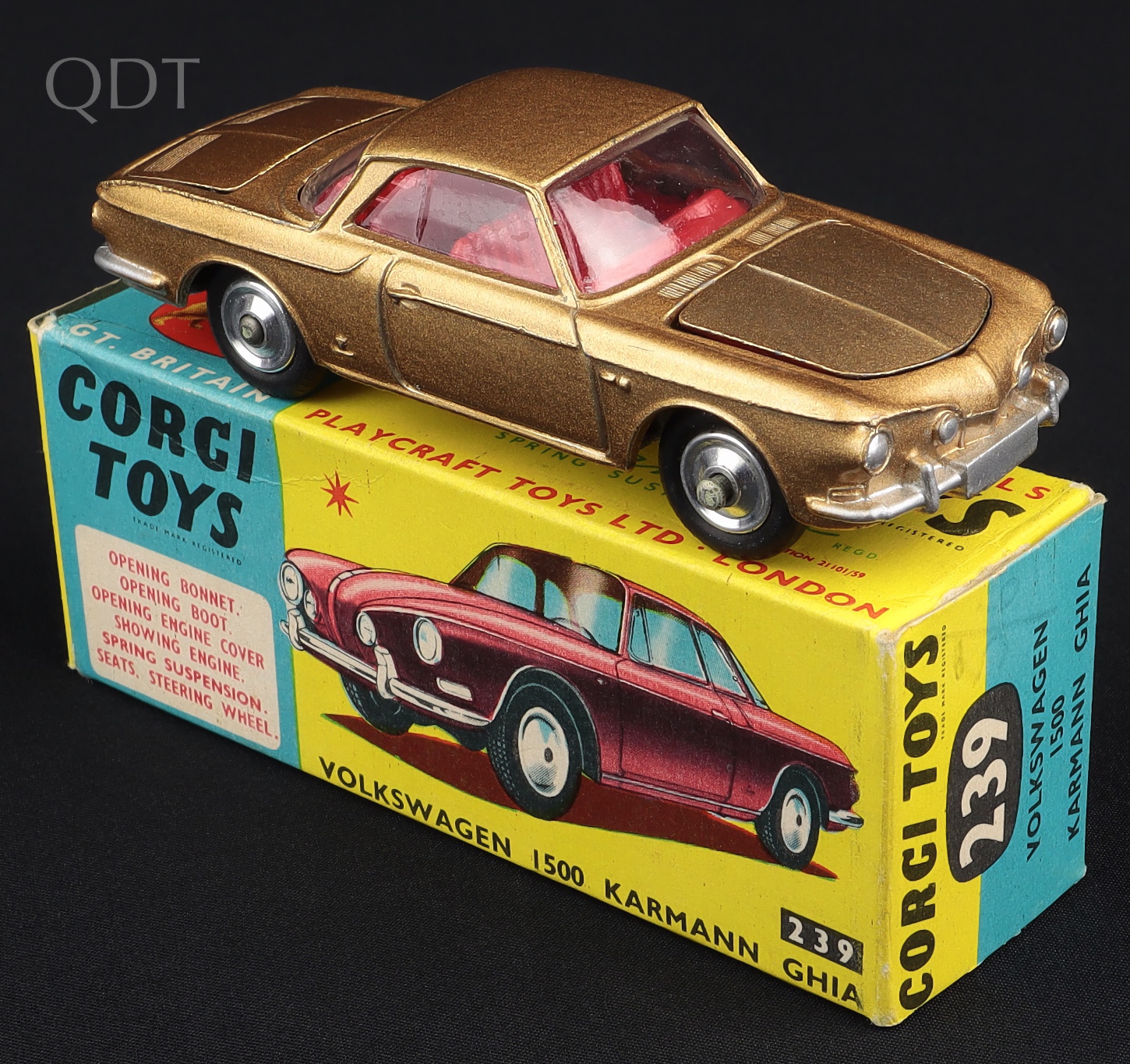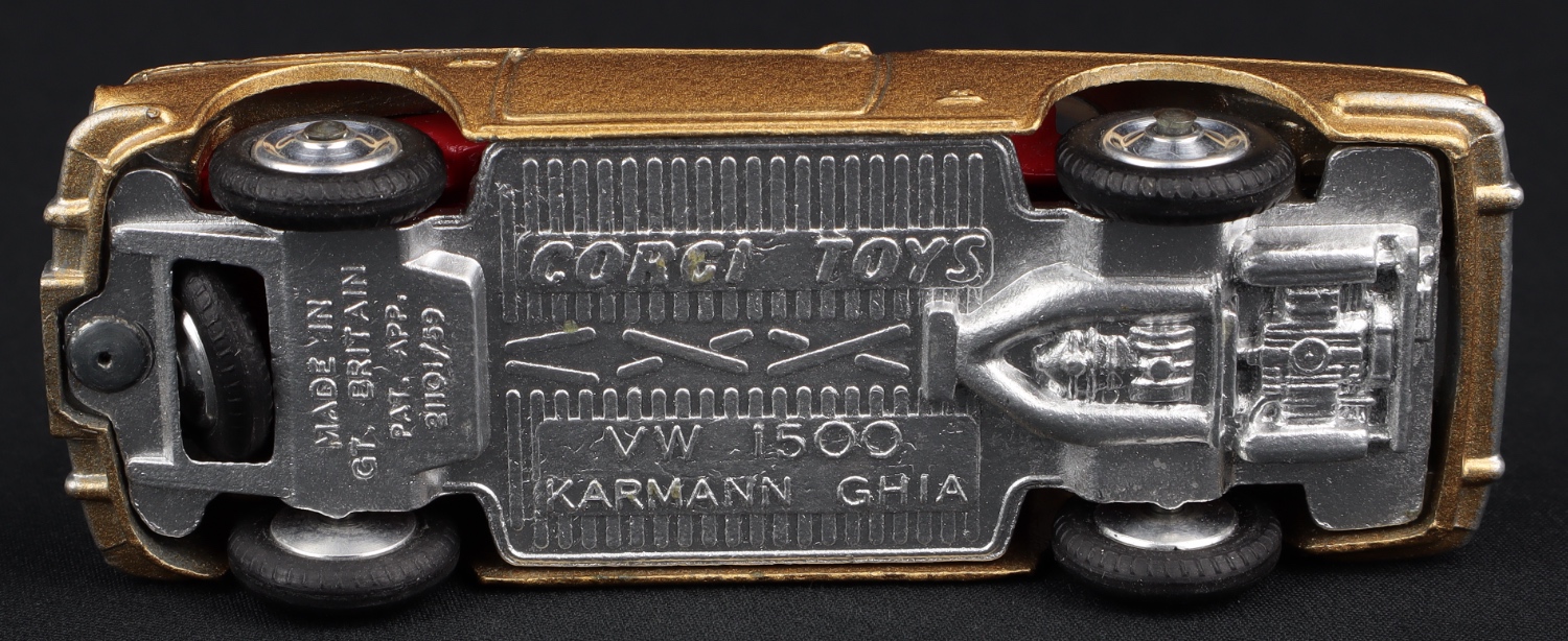 VW 1500 Karmann Ghia by Corgi Toys, No. 239. Very near mint/boxed. Scarce gold issue with bright red interior. With suitcase & spare wheel. From The Eccles Collection.