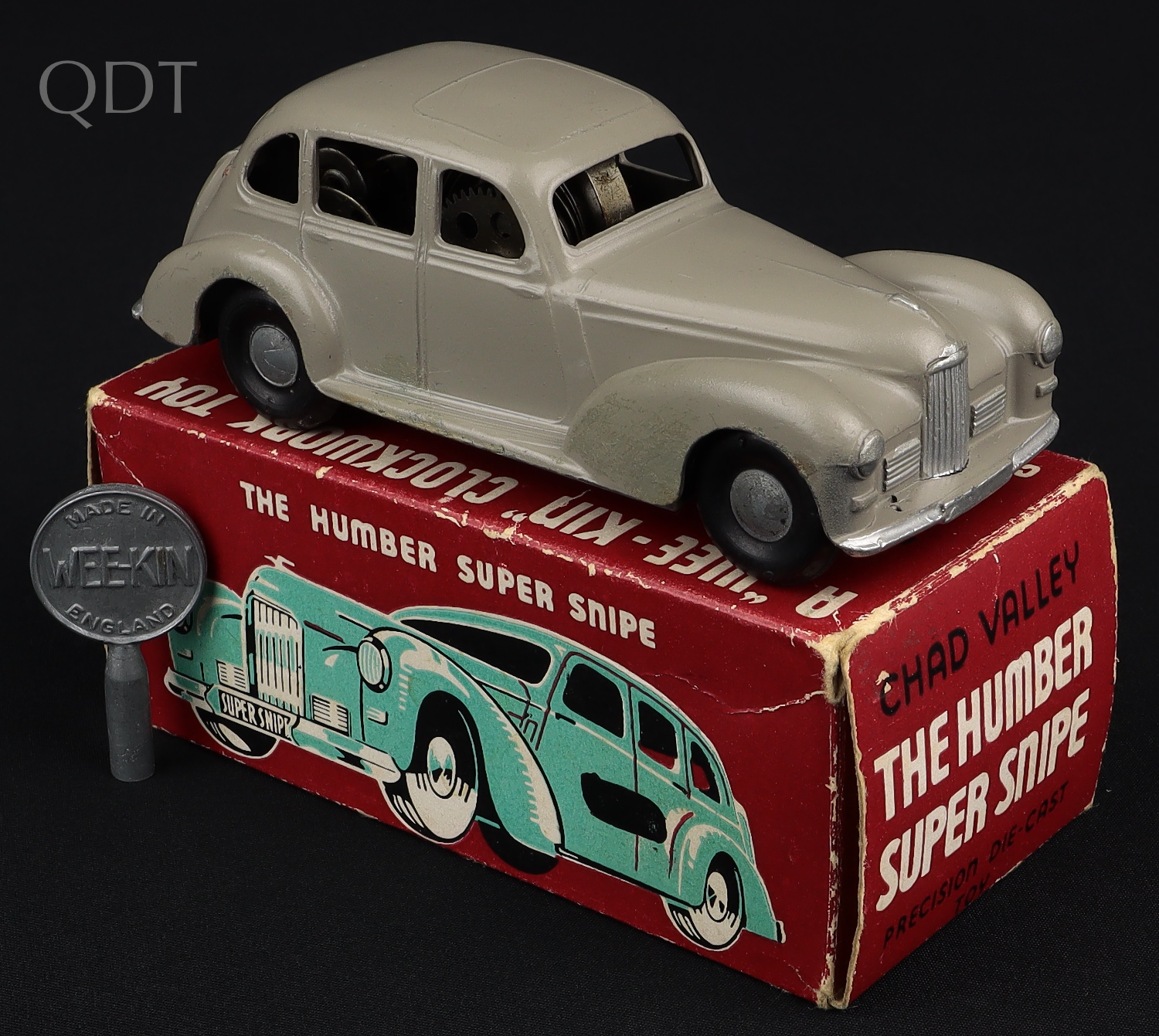 The Humber Super Snipe by Chad Valley (Wee-Kin). Scarce grey version. Very near mint (with working clockwork mechanism)/boxed. With original CHAD VALLEY Key. Scarce model from The Denis Tyler Collection. Starting bid £75. Please note that QDT apply 12.5% buyer's commission.