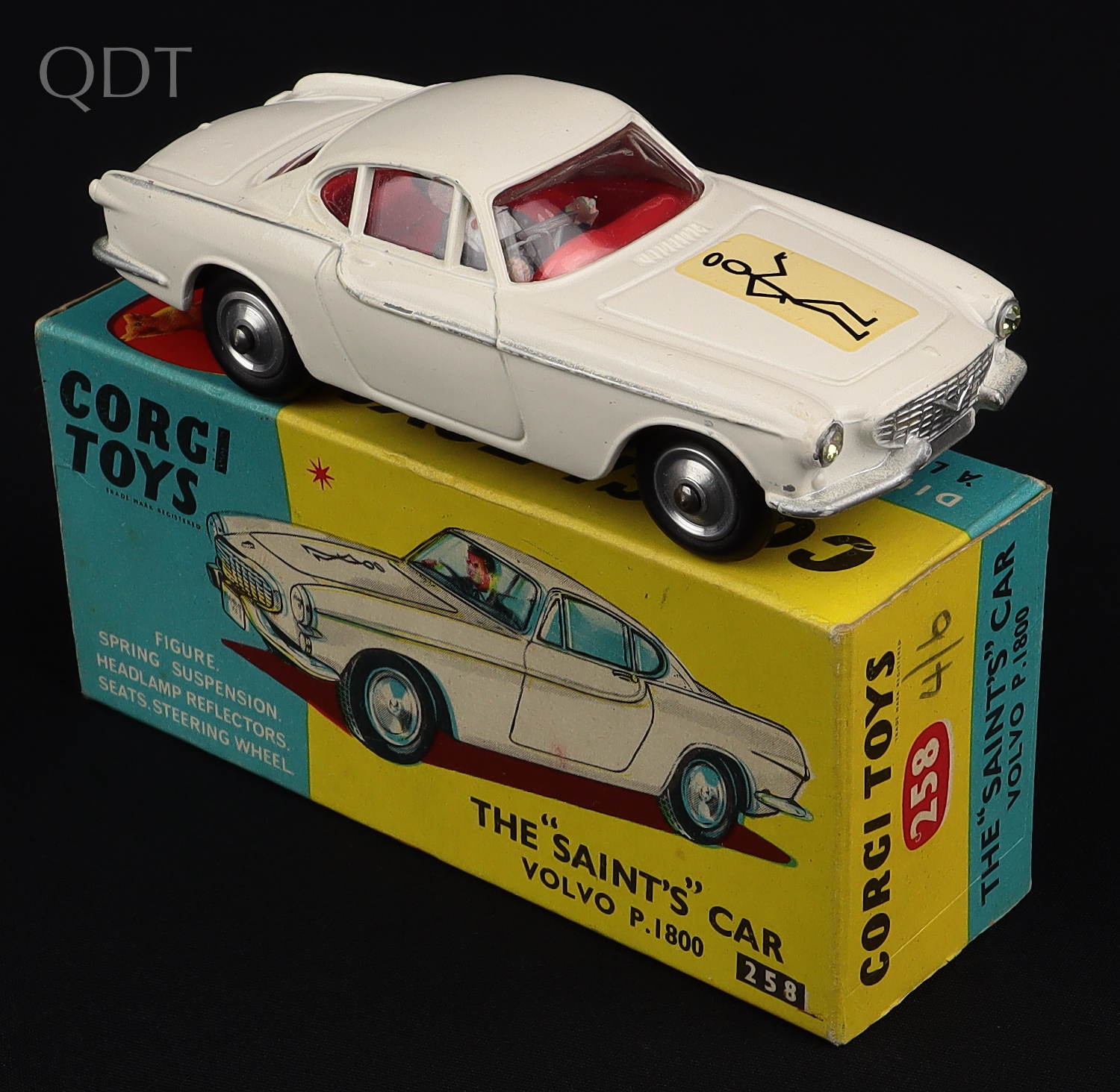 The "Saint's" Car Volvo P.1800 by Corgi Toys, No. 258. Very, very near mint/boxed. First issue with a black Saint logo figure on a cream background. From The Elmer Collection.