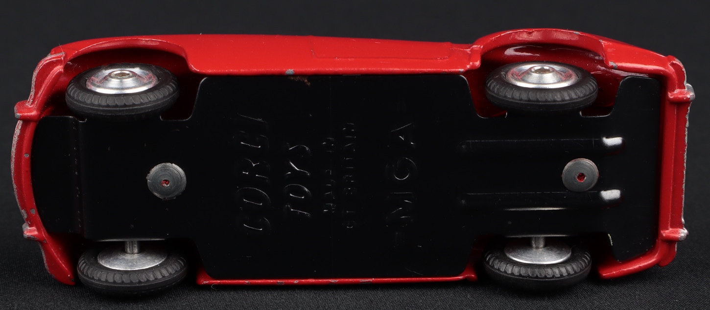 A desirable Corgi sports car issued between 1957-65. This car has a gleaming deeper red, original paint finish, cream interior, silver steering wheel, intact original windscreen, shining shaped spun hubs.