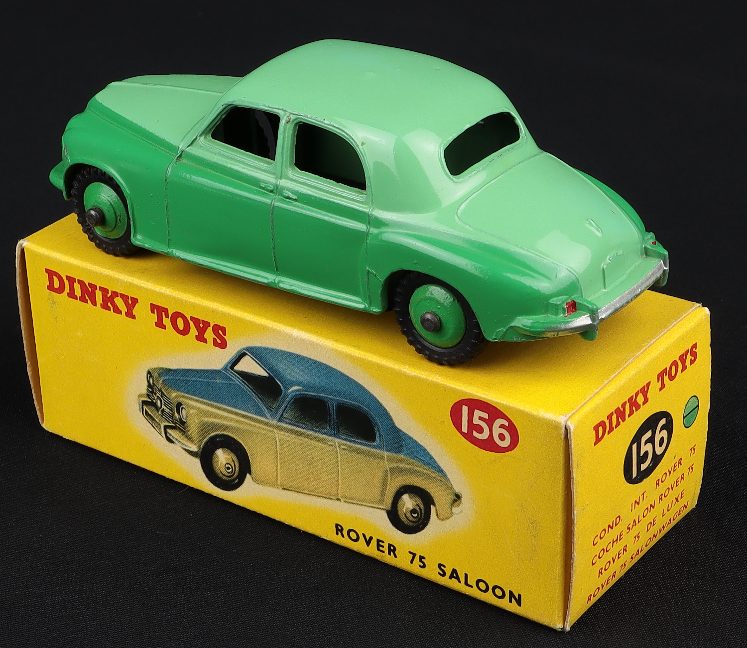 Rover 75 Saloon by Dinky Toys, No. 156. Two-tone green version. Scarce version with DARKER GREEN LOWER & LIGHTER GREEN UPPER. Large print baseplate. Very near mint/boxed. From The Dutch-Hillman Collection.