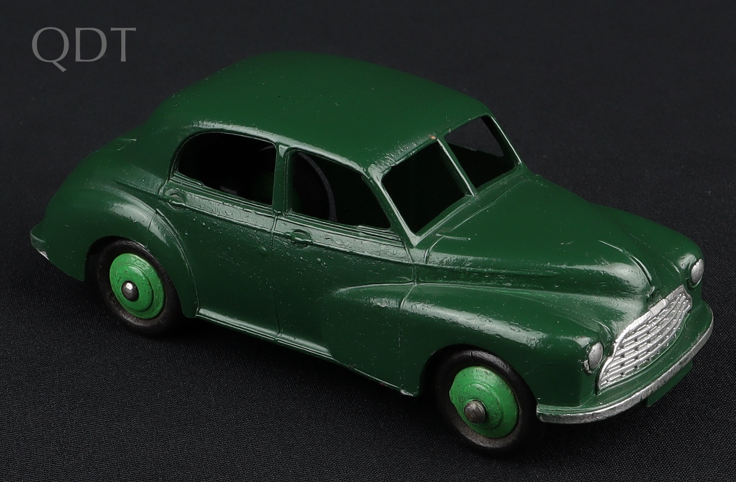 A lustrous very dark green paint finish on this early Dinky car with 1st type baseplate (small print and chassis rails). Mid-green wheels. Bright baseplate and axles.