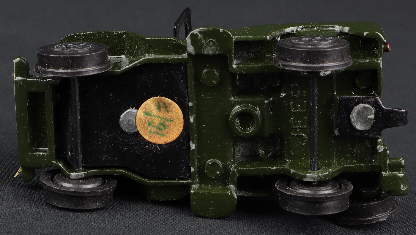 Lustrous military green finish on this Army Jeep with complete transfers and an intact light green aerial, fine one-piece black plastic wheels & tyres. Intact tow hook, steering wheel and shiny base. Shiny black windscreen. Complete matte bonnet paper label. Complete ‘U.S’ label at the front bumper.