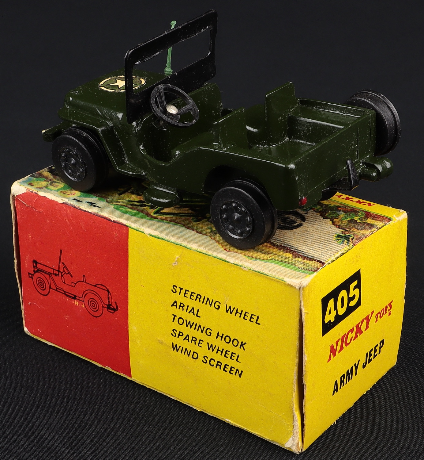 Army Jeep by Nicky (Dinky) Toys, No. 405. Military green with matte paper label. Near mint plus/boxed. Starting bid £225. Please note that QDT apply 12.5% buyer's commission.