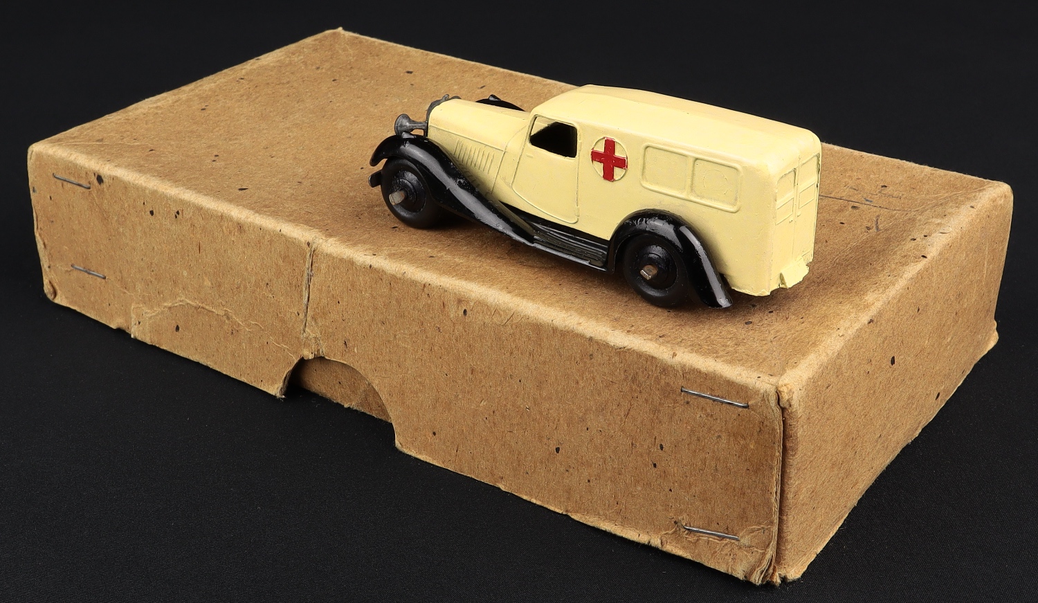 Very close to mint cream and black finish with bright red cross details on both sides. This all original early Dinky ambulance has a close to perfect cream and black finish with bright red cross details on both sides. This version has filled-in rear side windows. Complete headlight and radiator assembly, black ridged wheels, smooth tyres (no flat spots) and crimped axles.