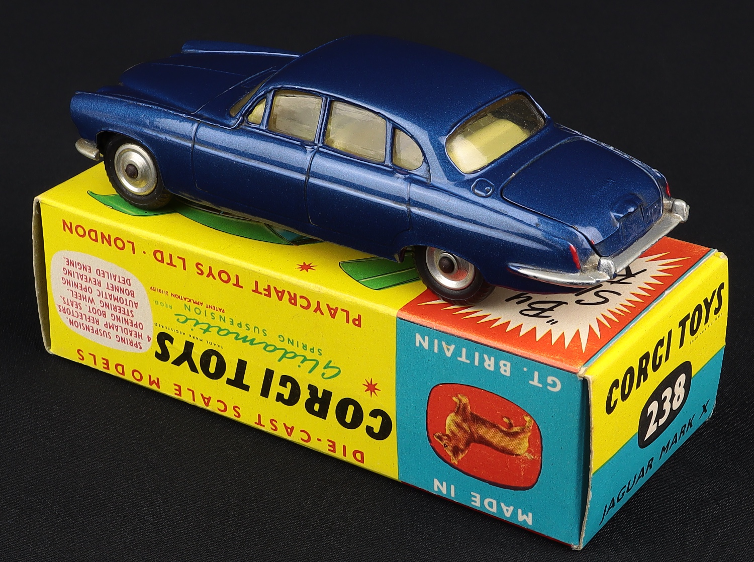 Jaguar Mark X by Corgi Toys, No. 238. Scarce deep metallic blue issue with a red interior. Very near mint/boxed. With both suitcases. Scarce model from The Eccles Collection. QDT starting bid £250. Please note that QDT apply 12.5 % buyer's commission.