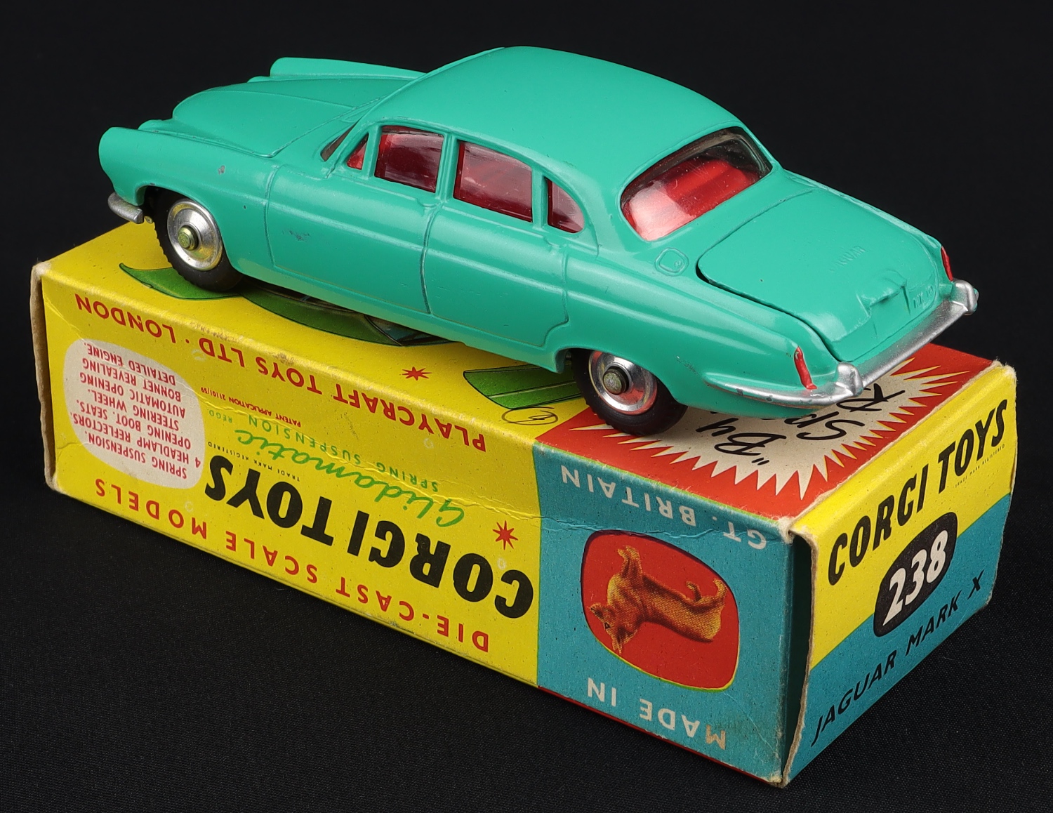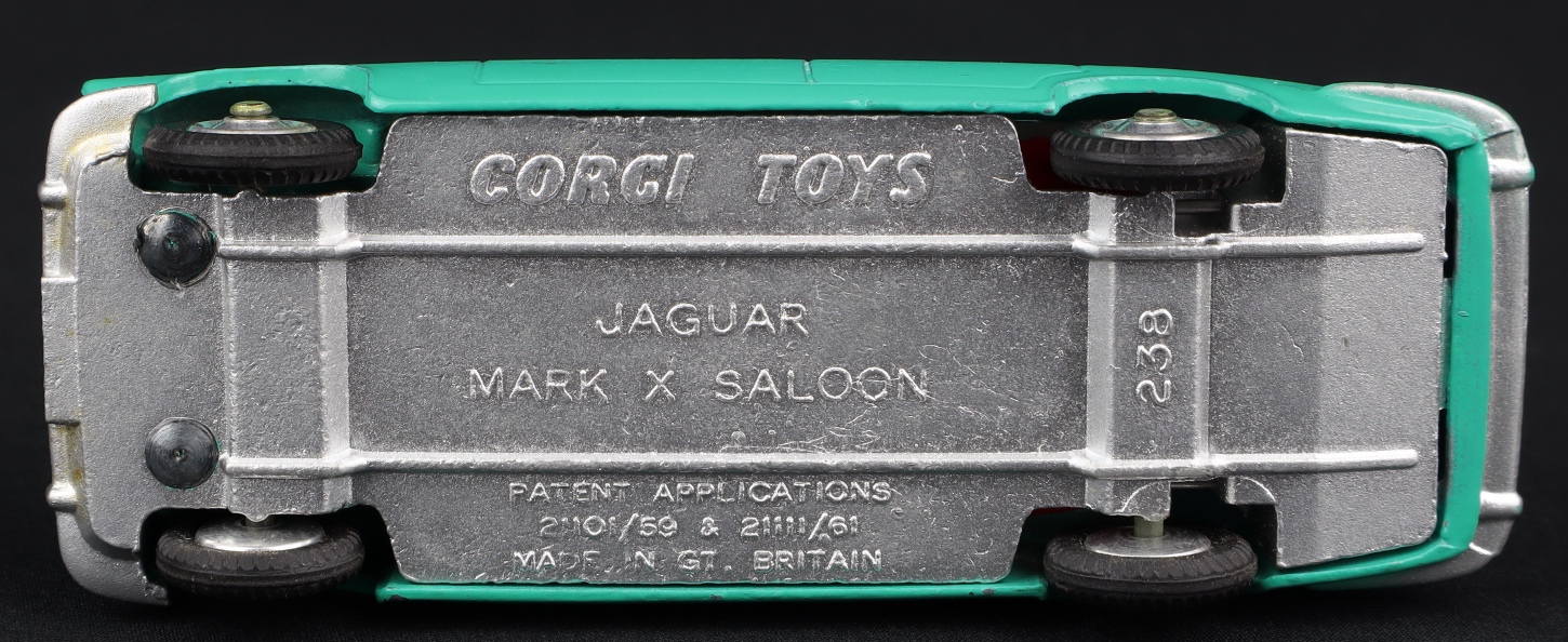 Jaguar Mark X by Corgi Toys, No. 238. Very near mint/boxed, with both items of luggage. Scarce SEA-GREEN version. From The Eccles Collection. QDT starting bid £250. Please note that QDT apply 12.5 % buyer's commission.