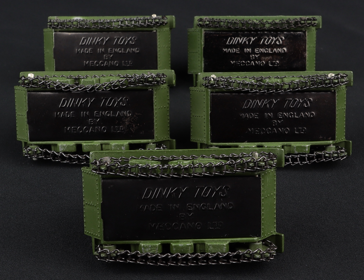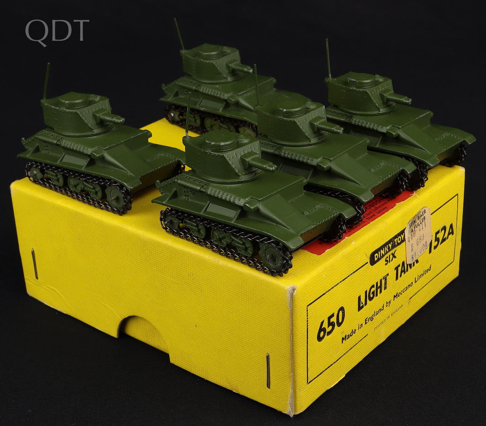 Light Tank x 5 by Dinky Toys, No. 152A in original Dinky Trade Box, with card dividers. Military green. Black base. Export version. Very near mint - very , very near mint. Scarce military item. Old shop stock from The Off-shore Collection. QDT starting bid £300. Please note that QDT apply 12.5% buyer's commission.