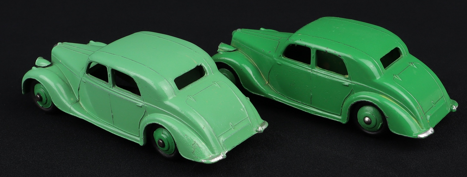 2) Dinky 40A Riley Saloon in deeper green with matching wheels, well-shaped smooth black tyres and a first type baseplate with small print. In close to mint condition, with minor marks, minor light ‘blooming’ in places.