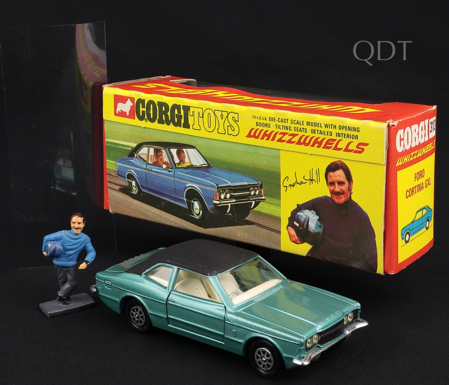 Graham Hill's Ford Cortina GXL by Corgi Toys, No. 313. Very, very near mint/boxed, with plastic packing piece. With Graham Hill figure. Metallic blue-green version. From The Hampshire Collection.