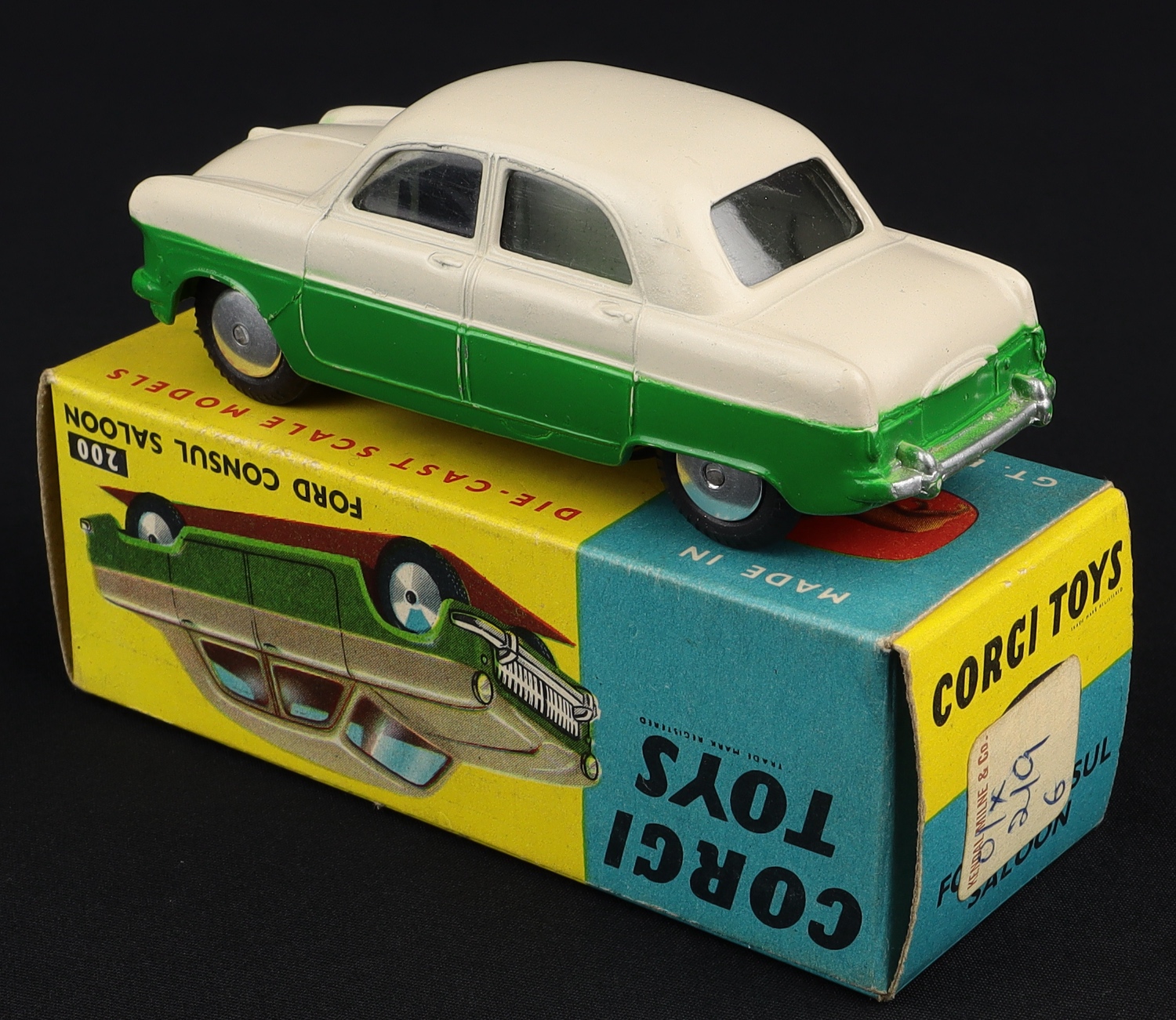 Ford Consul Saloon by Corgi Toys, No. 200. Near mint plus/boxed. Scarce two colour issue in GLOSS OYSTER over mid-green. From The Eccles Collection.