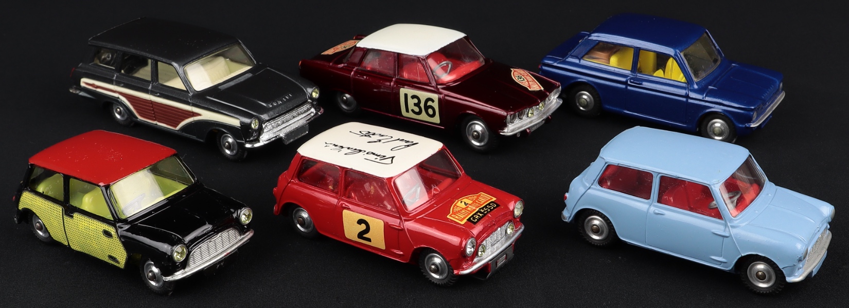 3) Corgi 251 Hillman Imp in deep metallic blue finish, yellow interior, shaped spun wheels. So often these models are found with broken suspension at the rear, since it is by depressing the rear wheels that one is able to fold down the rear seats. Please note that the suspension is notably present on all four wheels. Shiny spun wheels and as-new original tyres.