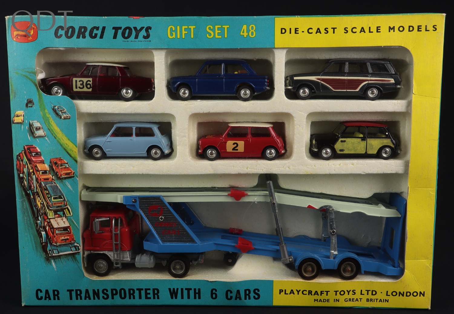 Corgi Car Transporter (Ford) with 6 Cars by Corgi Toys, Gift Set 48. Near mint - very, very near mint/boxed.With Retailer Card. From 1967. With still-sealed packet of traffic cones , Transporter Leaflet & Hillman Imp Leaflet. Scarce Gift Set from The Elmer Collection. Starting bid £500. Please note that QDT apply 12.5% buyer's commission.