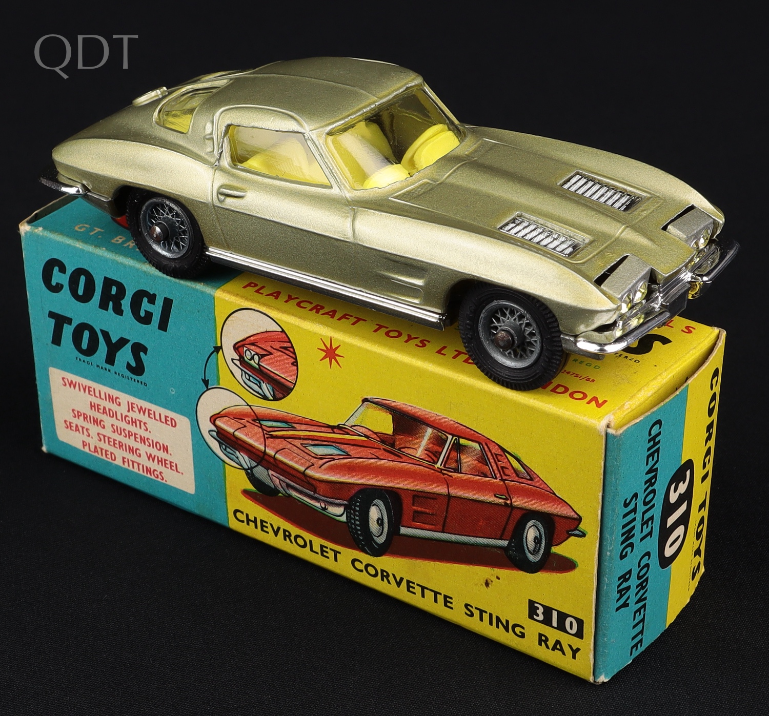 Chevrolet Corvette Sting Ray by Corgi Toys, No. 310. Very, very near mint/boxed. Scarce CHAMPAGNE version. An exceptional find! From The Gower Collection. QDT starting bid £200. Please note that QDT apply 12.5% buyer's commission