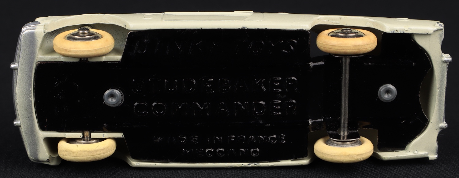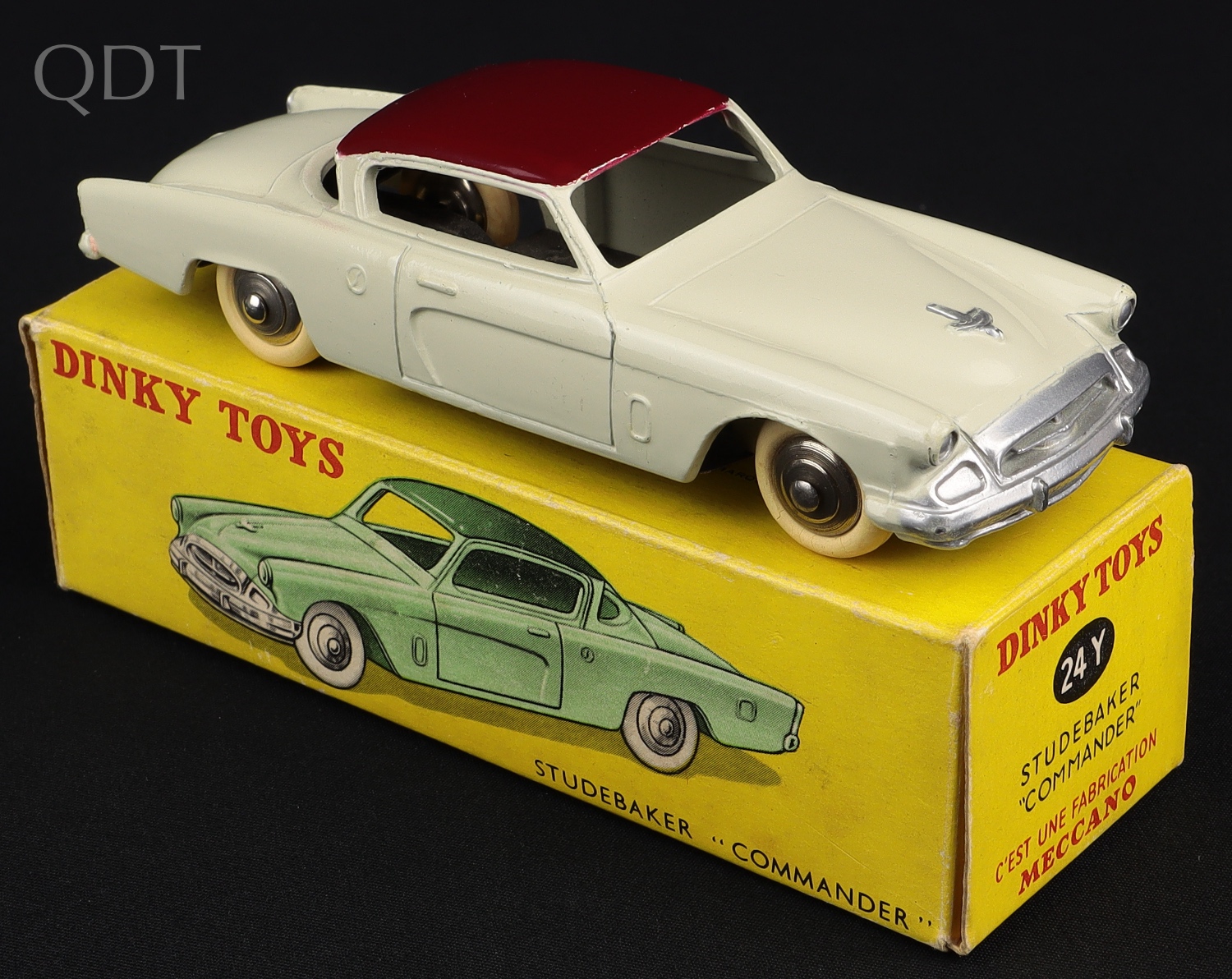 Studebaker Commander by French Dinky Toys, No 24Y. Very near mint/boxed. Rarest version in very pale fawn with maroon roof only. From The Dutch-Hillman Collection. QDT starting bid £450. Please note that QDT apply 12.5% buyer's commission.