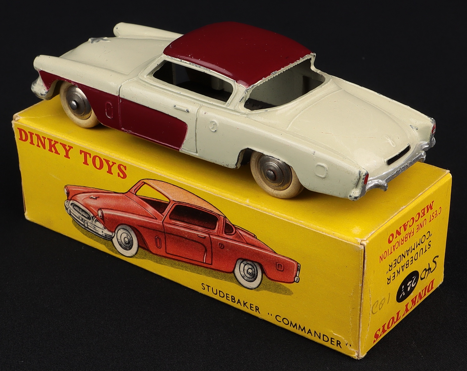 Studebaker Commander by French Dinky Toys, No. 24Y. Near mint plus/boxed. Scarce issue in very pale grey with maroon roof and side panels. From The Dutch-Hillman Collection.