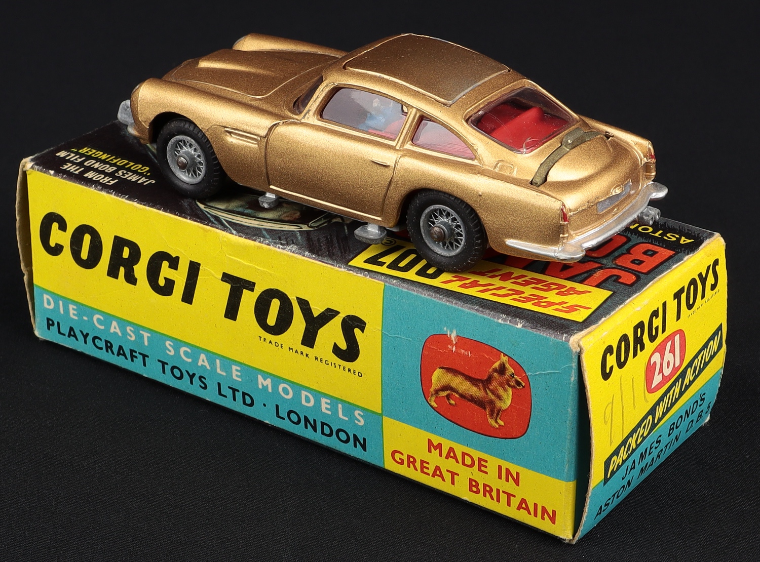 James Bond's Aston Martin D.B.5 by Corgi Toys, No. 261. Very near mint/boxed. 2nd issue. Version WITHOUT INDICATOR LIGHT CASTING. With FULL Secret Instruction Packet & 'Model Car Makers to James Bond' Leaflet. 2nd issue box.