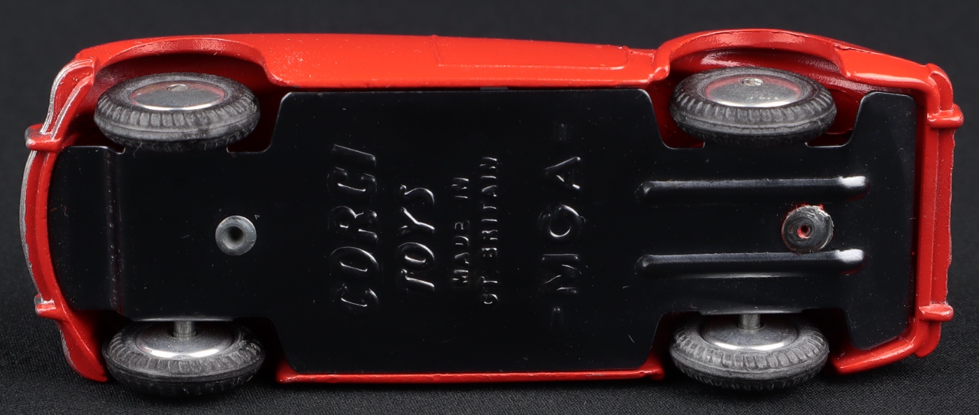 MGA Sports Car by Corgi Toys, No. 302. Very, very near mint/boxed. Early SCARLET issue with flat spun wheels. LIGHT GREY PLASTIC STEERING WHEEL. Bright non-picture box with stamped ends. From The Elmer Collection.