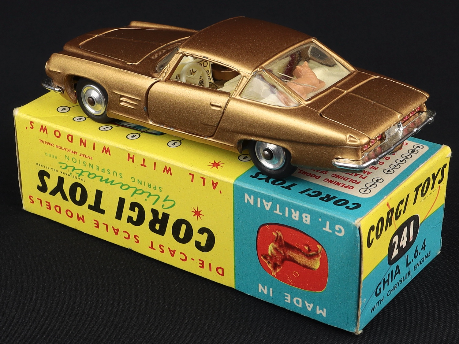Ghia L6.4 by Corgi Toys, No. 241. Near mint plus (WITH suspension)/boxed. *GOLD version with IVORY interior, SPUN wheels*. Scarce. From The Elmer Collection.