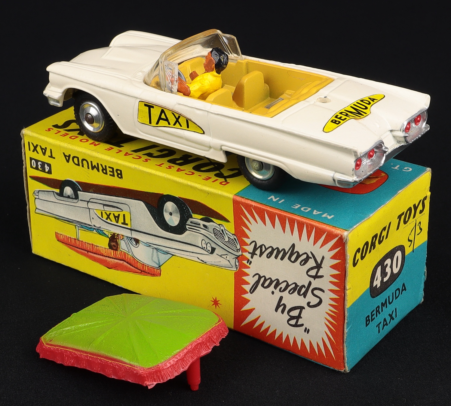 Ford Thunderbird Bermuda Taxi by Corgi Toys, No. 430. Lime green & red canopy. Very near mint/boxed, with card packing. From The Elmer Collection.