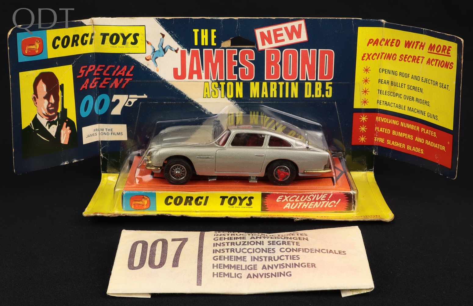 This is the more unusual version with dark red seating. It has the opening roof feature with the working ejector seat mechanism. Both figures of James Bond and villain are still seated inside. It has the rear bullet screen which can be raised and lowered, telescopic over-riders, retractable machine guns, revolving number plates and of course, the red tyre slasher blades on the rear wheels. All the features have been carefully tested (however, we find that the functions are very stiff, probably never having been used, and would not recommend using them if at all possible!).