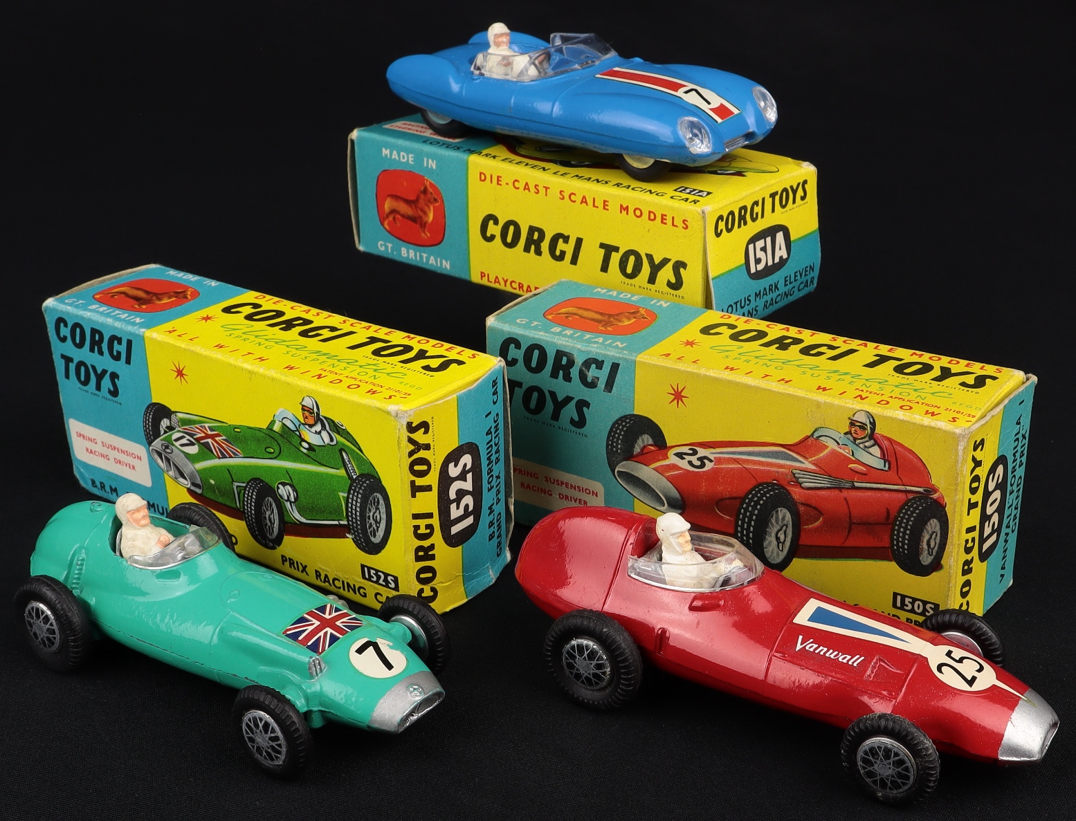 3) 150S Vanwall in vermillion red with racing number 25, driver, flat spun wheels with suspension. Corgi wheel trims applied. Very near mint. Complete racing number.