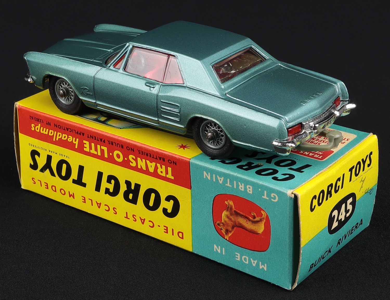 Buick Riviera by Corgi Toys, No. 245. Scarce metallic GREEN-BLUE issue with SPOKED WHEELS. Very near mint/boxed. From The Berlin Collection.