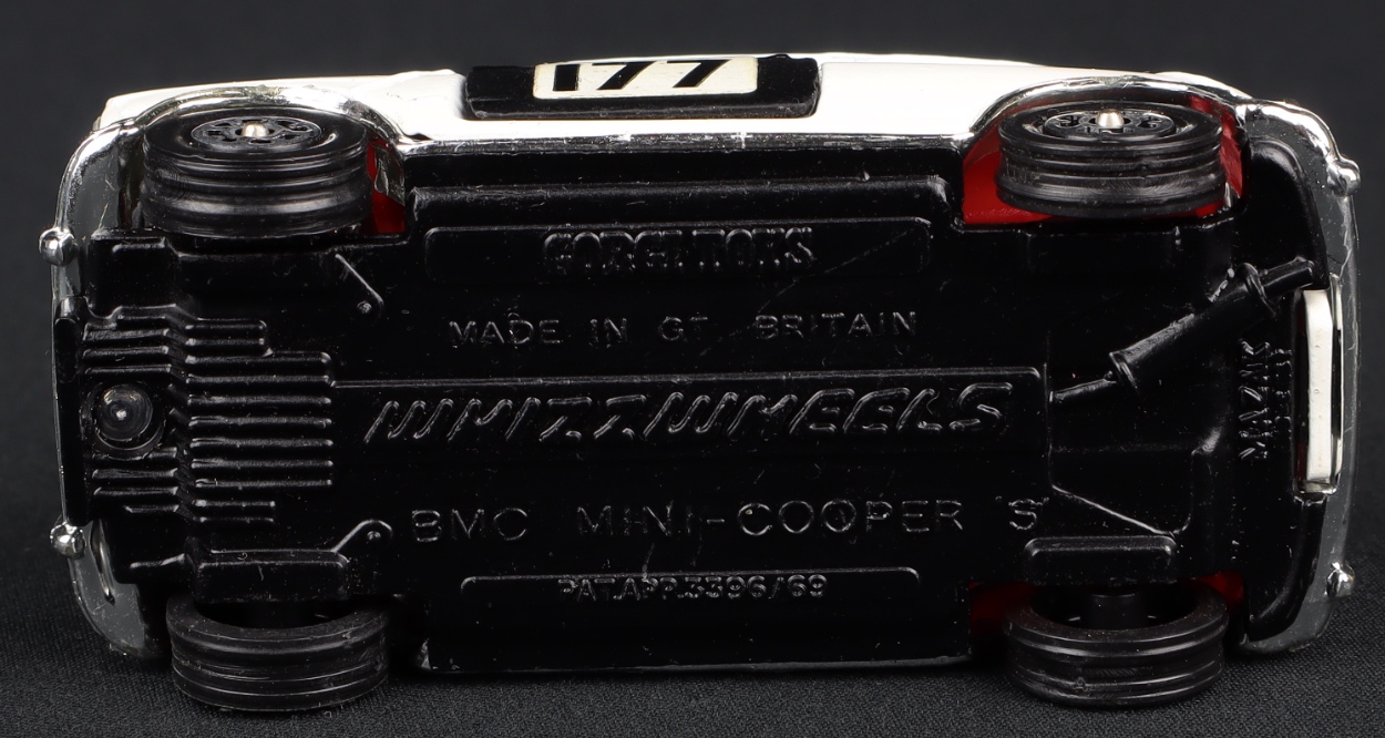 This sought-after little car was made by Corgi between 1971-74. It has a smart black and white finish with a luminous orange and black paper stripe label on the roof. Racing numbers ‘177’. Bright red detailed interior, jewelled headlights, Whizzwheels. Opening bonnet and boot. Unrubbed chrome details.