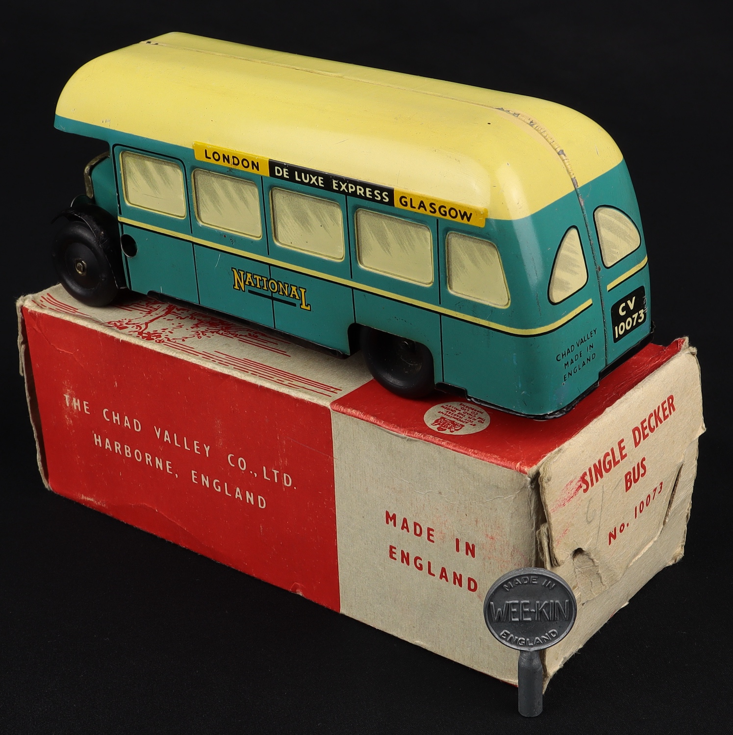 Single Decker Motor Bus by Chad Valley, No. 10073. Near mint/boxed. Scarce find in blue & cream. With working clockwork motor & key. From The Denis Tyler Collection. Starting bid £75. Please note that QDT apply 12.5% buyer's commission.