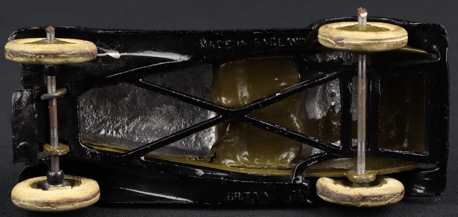Early issue with green metal wheels and well-shaped smooth white tyres, separate radiator headlight assembly & windscreen frame. This Staff Car has a close to mint military gloss olive green finish with black running boards.