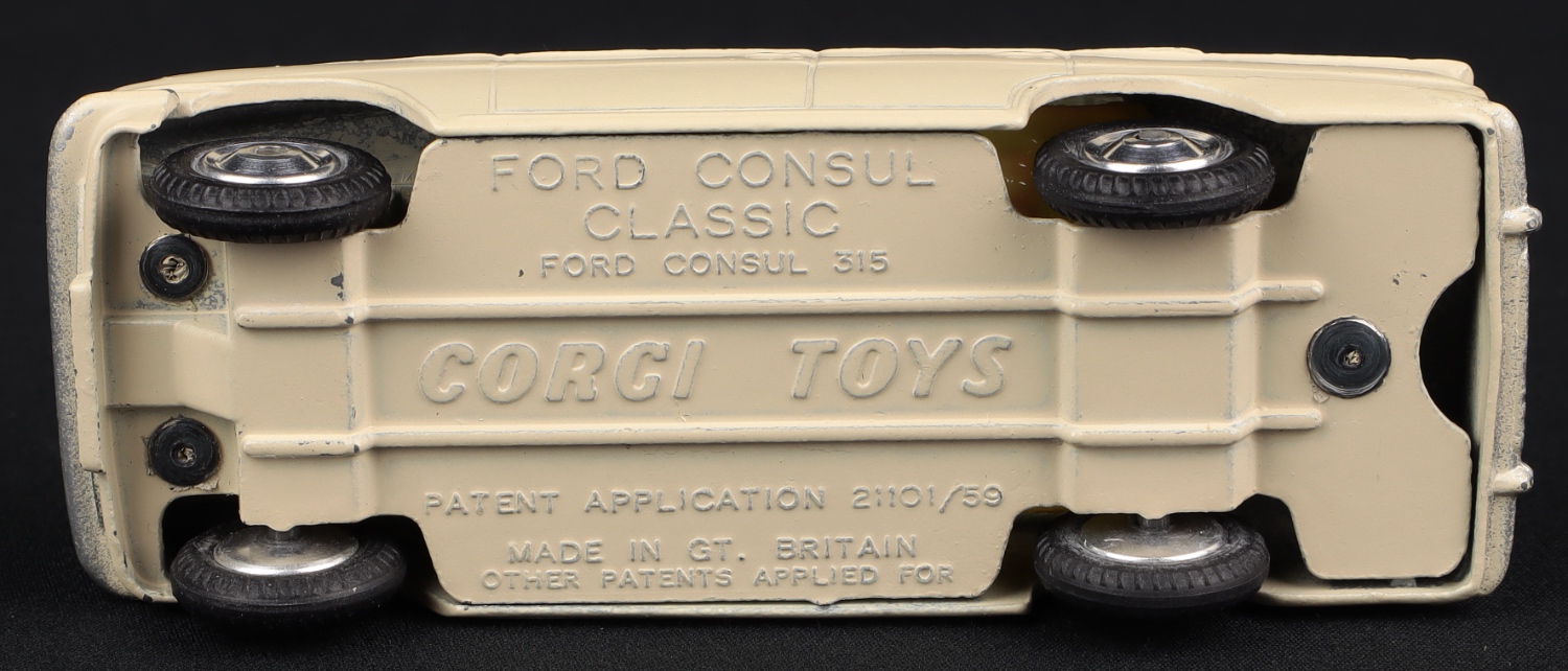 Issued between 1961-65 in various shades, this Consul Classic model has a light beige finish with a vivid pink roof, lemon interior. Opening bonnet, spring suspension on all four wheels. Shaped spun hubs are shiny. Well-shaped tyres.
