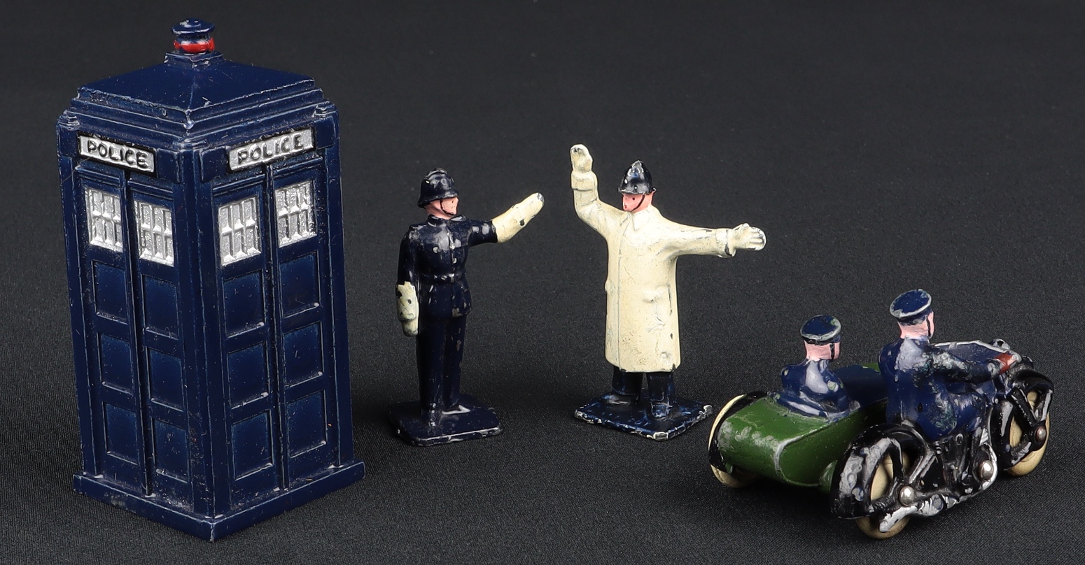 1) Dinky 42A Police Box with a deep blue finish with silver details. No crazing. An impressive example in very close to mint condition.
